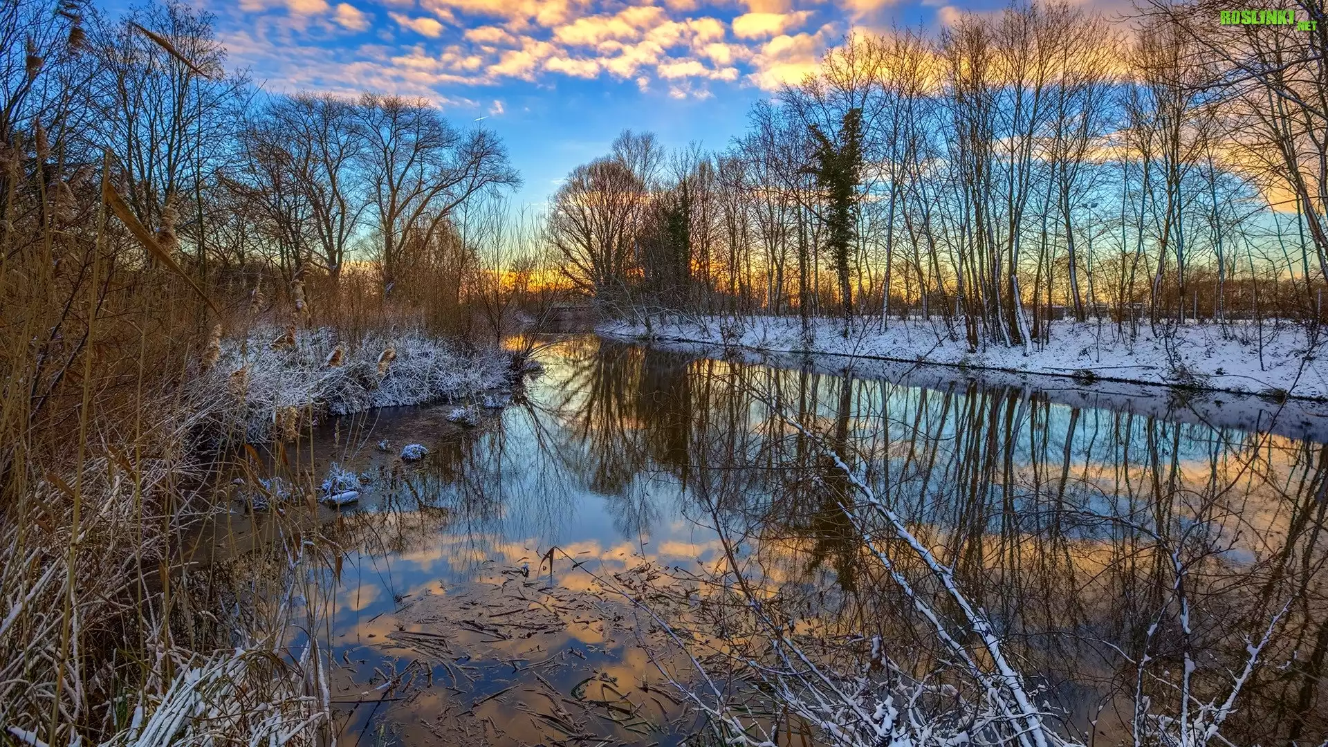 Rośliny: Zima, Rzeka, Drzewa, Trawy, Wschód słońca, Odbicie