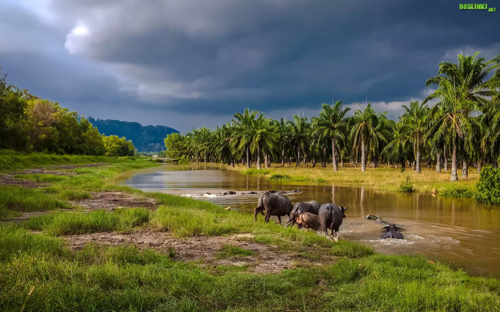Rośliny: Rzeka, Palmy, Zwierzęta, Kąpiel