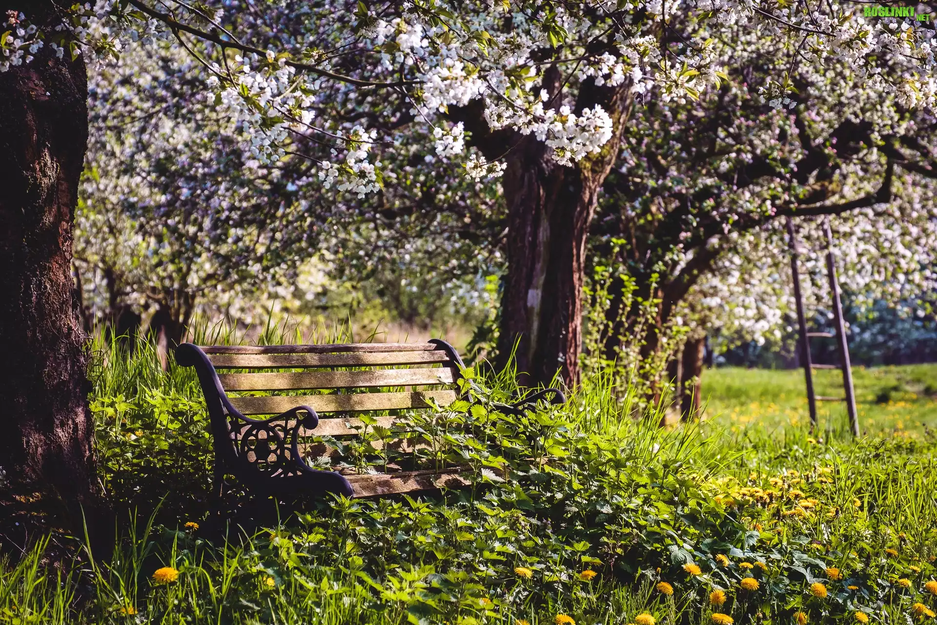 Rośliny: Sad, Kwitnące, Drzewa, Ławeczka, Trawa