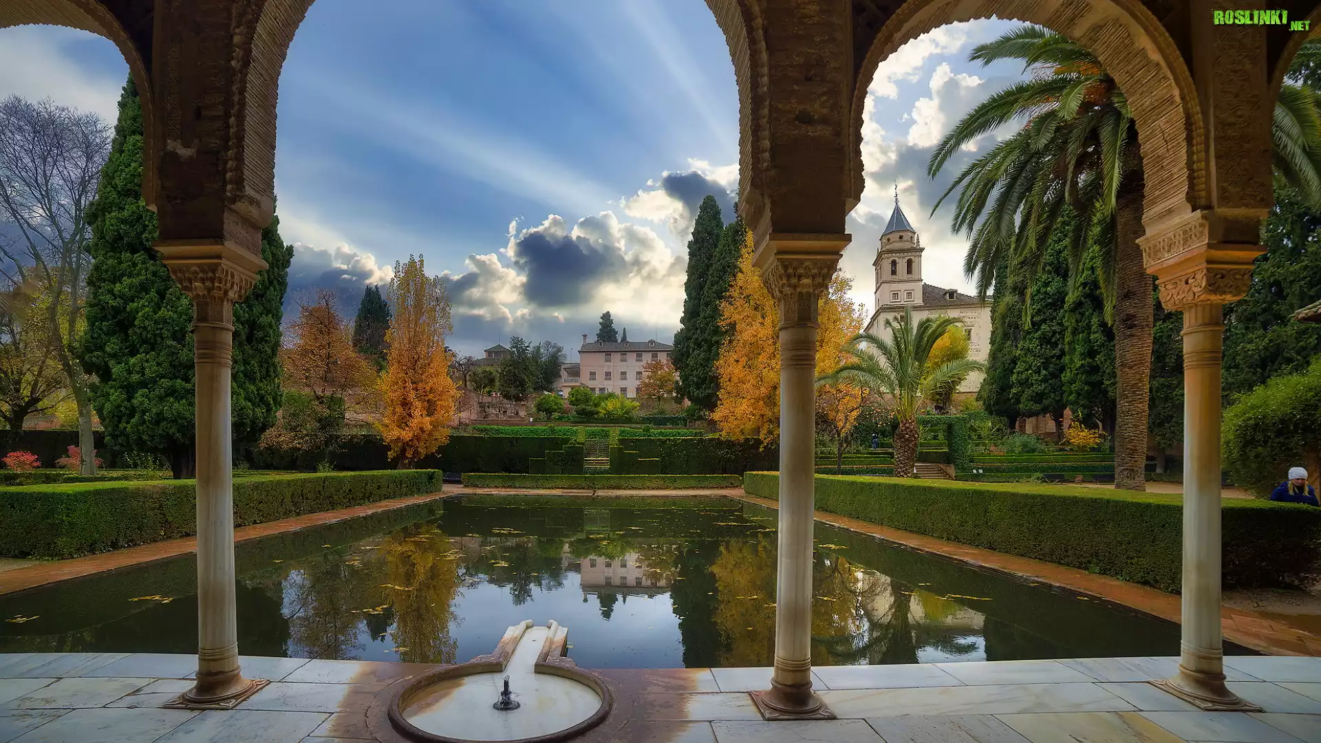 Rośliny: Pałac Partal, Sadzawka, Ogród, Portyk, Łuki, Drzewa, Palmy, Granada, Andaluzja, Hiszpania