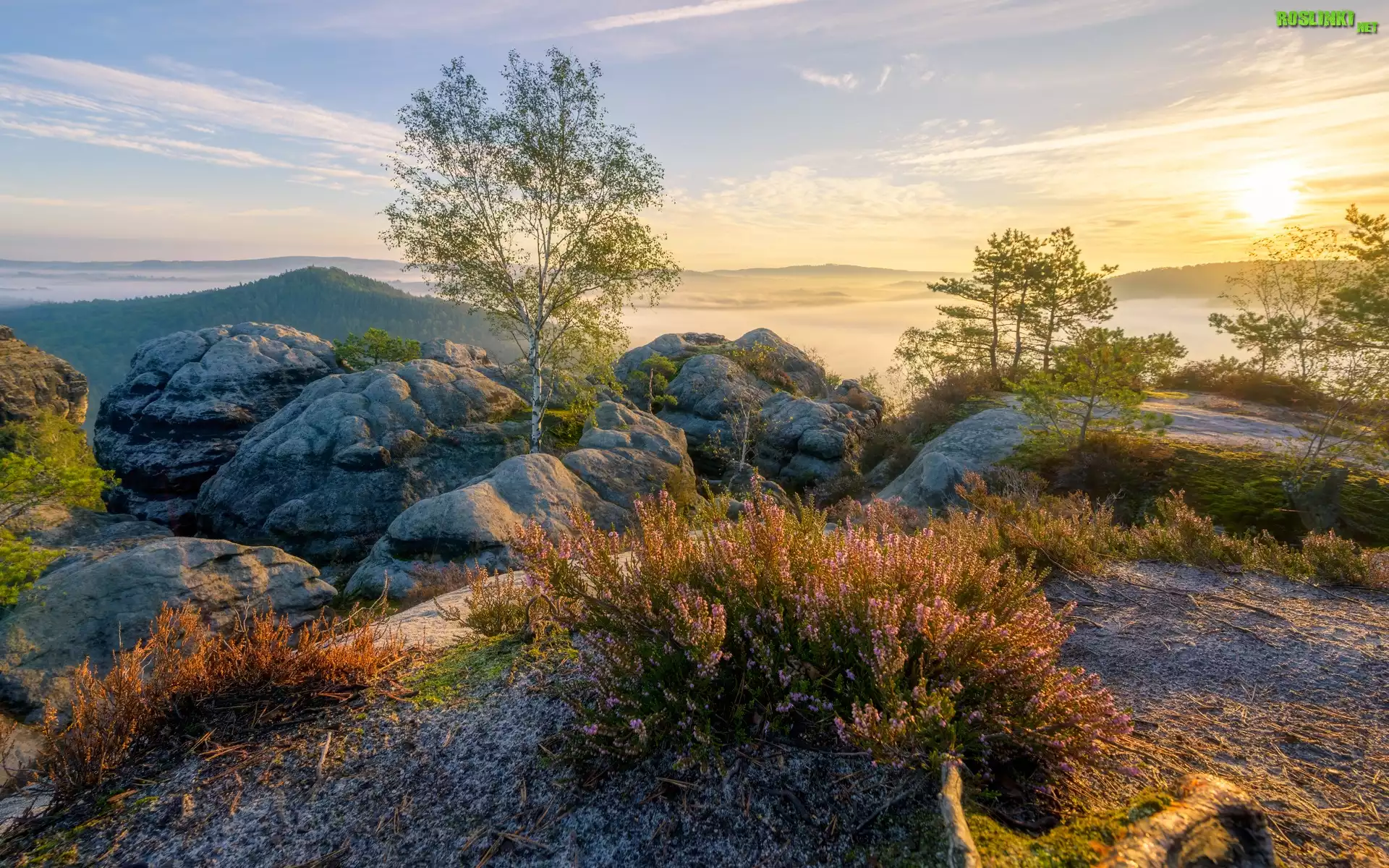 Niemcy, Park Narodowy Saskiej Szwajcarii, Góry Połabskie, Drzewa, Roślinność, Skały, Wschód słońca, Mgła |