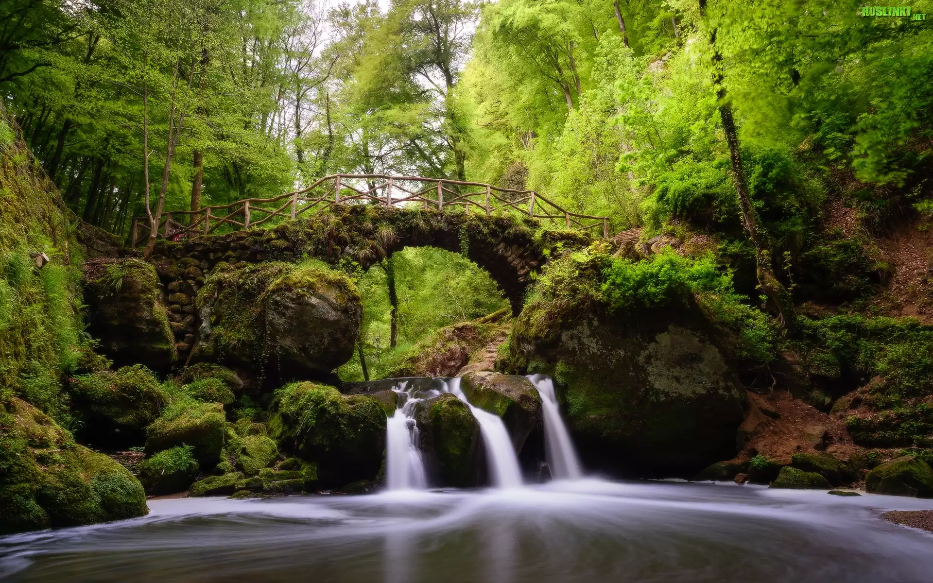 Las, Wodospad Schiessentumpel, Most, Rzeka, Skały, Drzewa, Mała Szwajcaria, Mullerthal, Luksemburg |