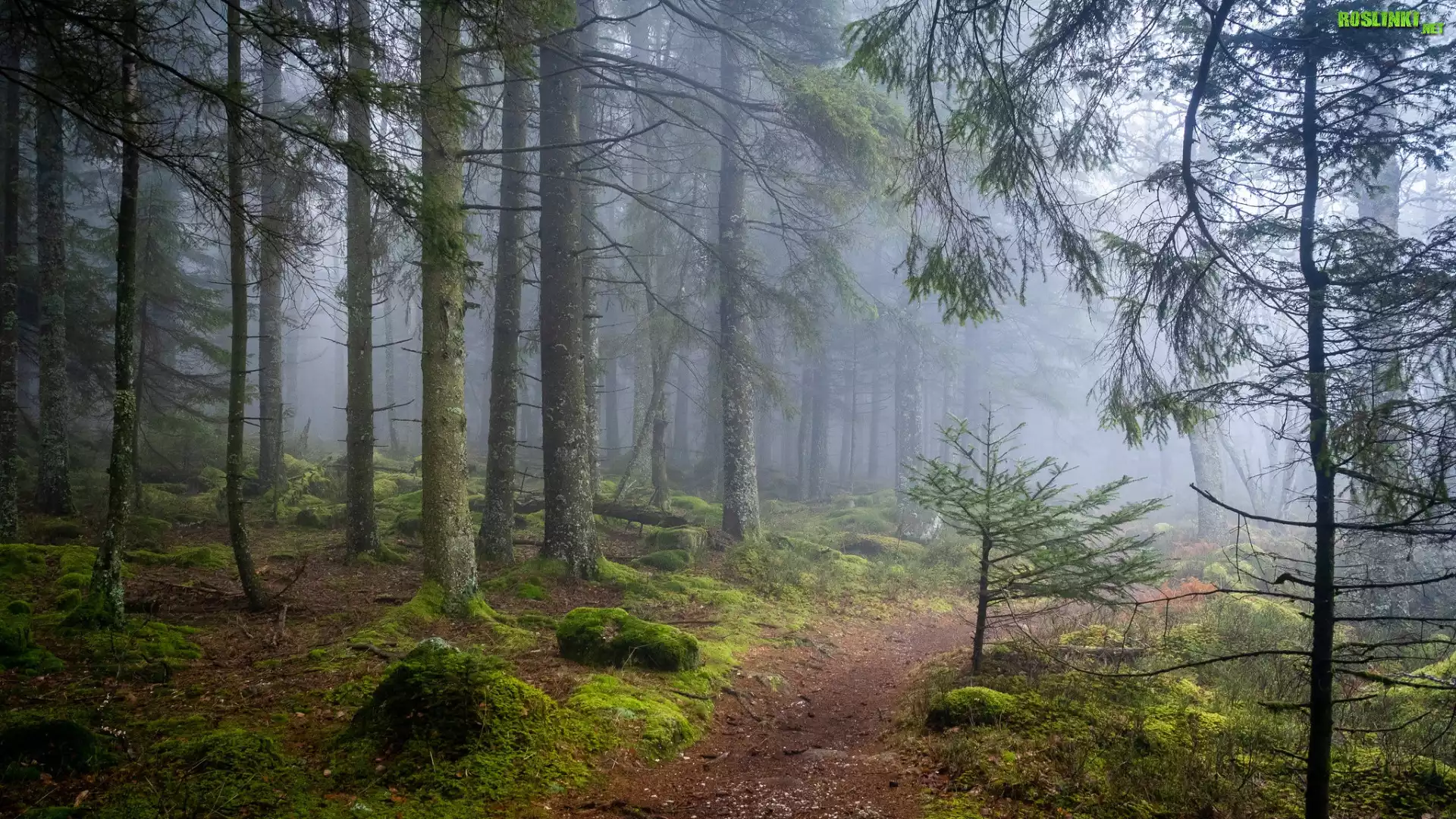 Rośliny: Las, Drzewa, Mgła, Ścieżka, Omszałe, Kamienie