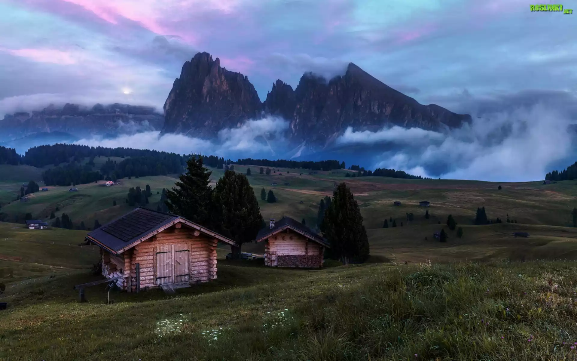 Rośliny: Góry, Alpy, Dolomity, Domki, Dolina, Drzewa, Mgła, Chmury, Płaskowyż Seiser Alm, Włochy