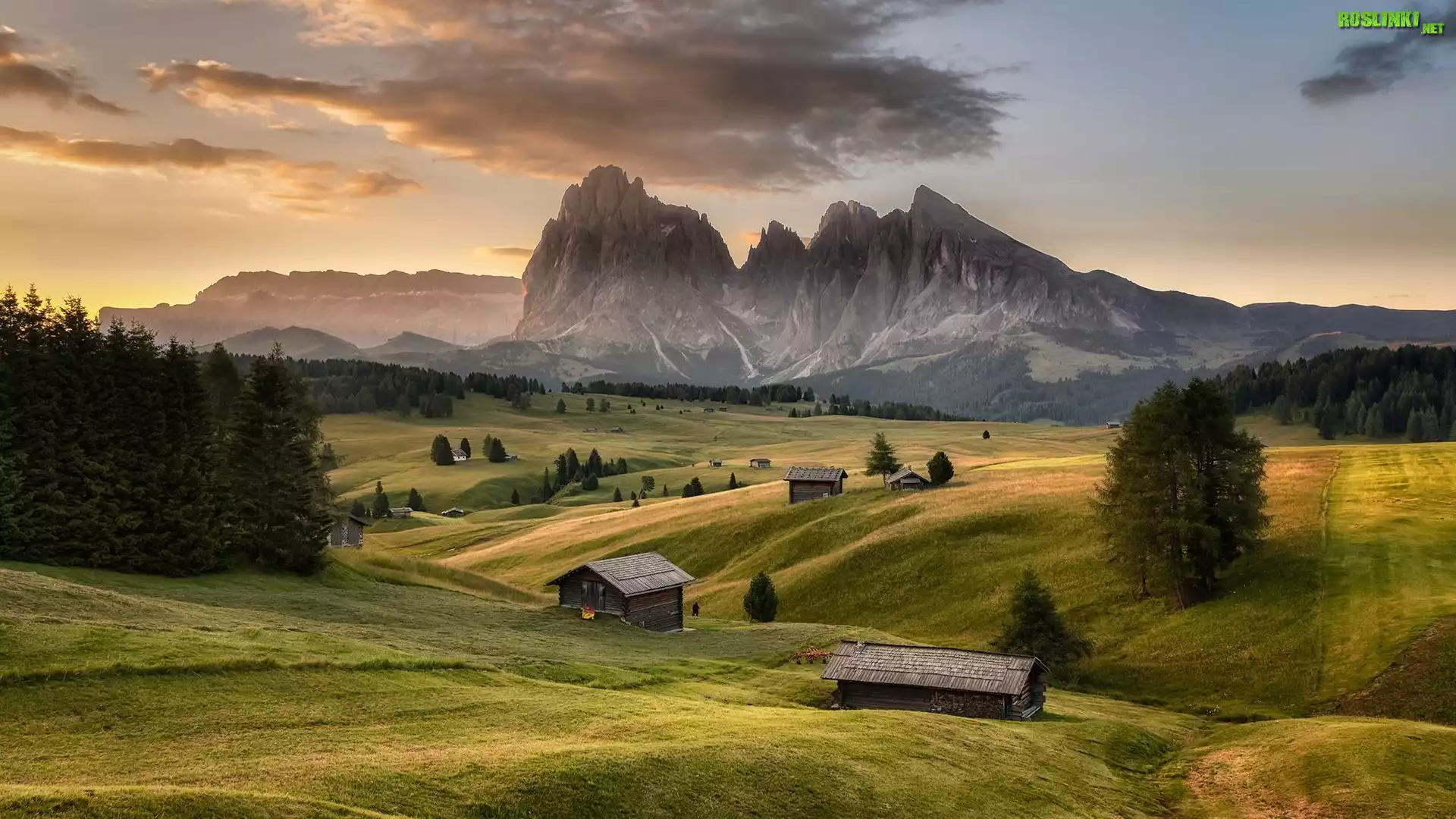 Dolomity, Góry, Sassolungo, Płaskowyż Seiser Alm, Dolina, Val Gardena, Drzewa, Chmury, Drewniane, Domy, Włochy |
