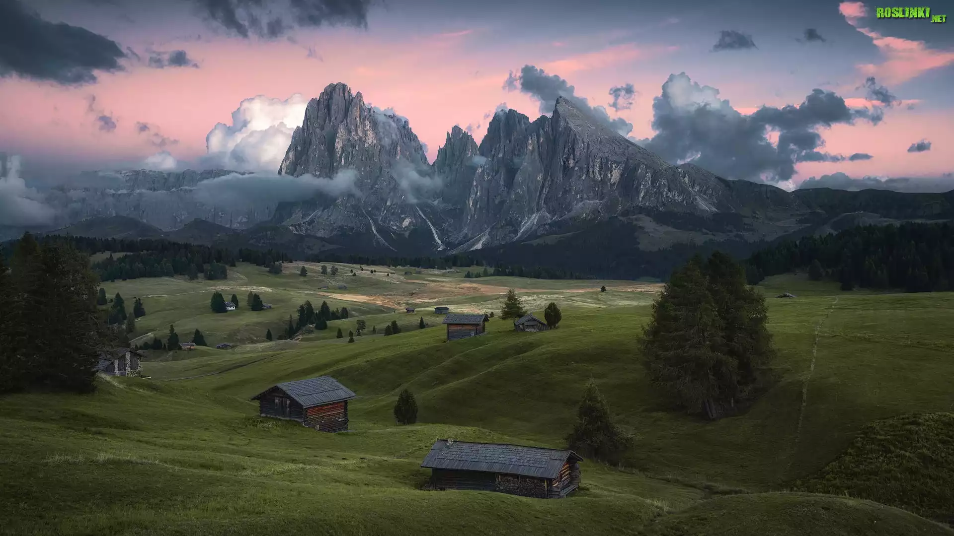 Dolomity, Góry Sassolungo, Płaskowyż Seiser Alm, Dolina Val Gardena, Drzewa, Chmury, Drewniane, Domki, Włochy |
