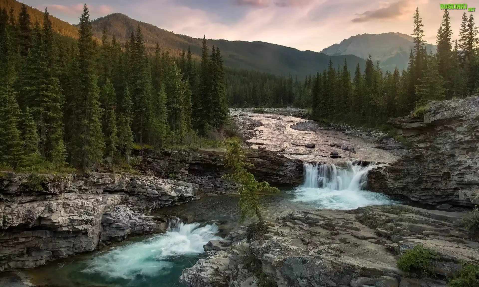 Góry Skaliste, Skały, Drzewa, Rzeka Sheep, Wodospad Sheep River, Prowincja Alberta, Kanada