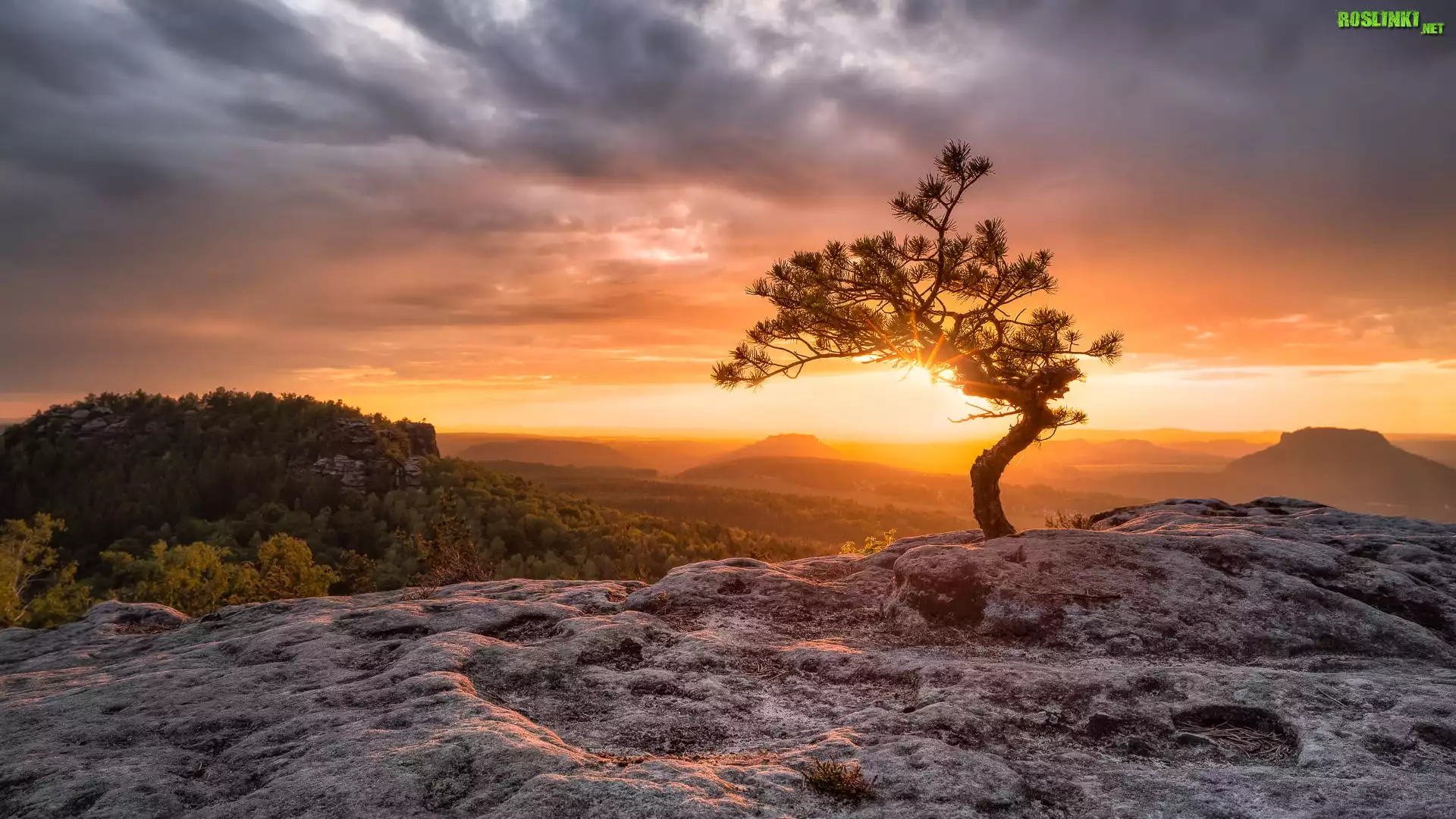 Góry, Skała, Drzewo, Sosna, Wschód słońca, Chmury