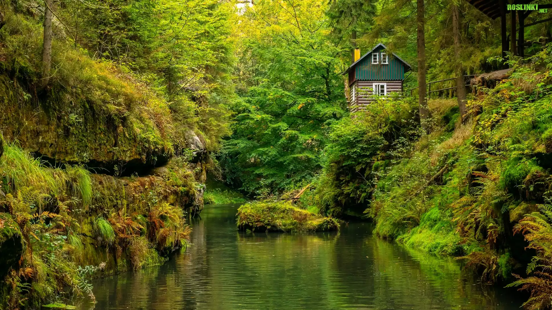 Rośliny: Roślinność, Drzewa, Skała, Dom, Rzeka Kamienica, Park Narodowy Czeska Szwajcaria, Czechy