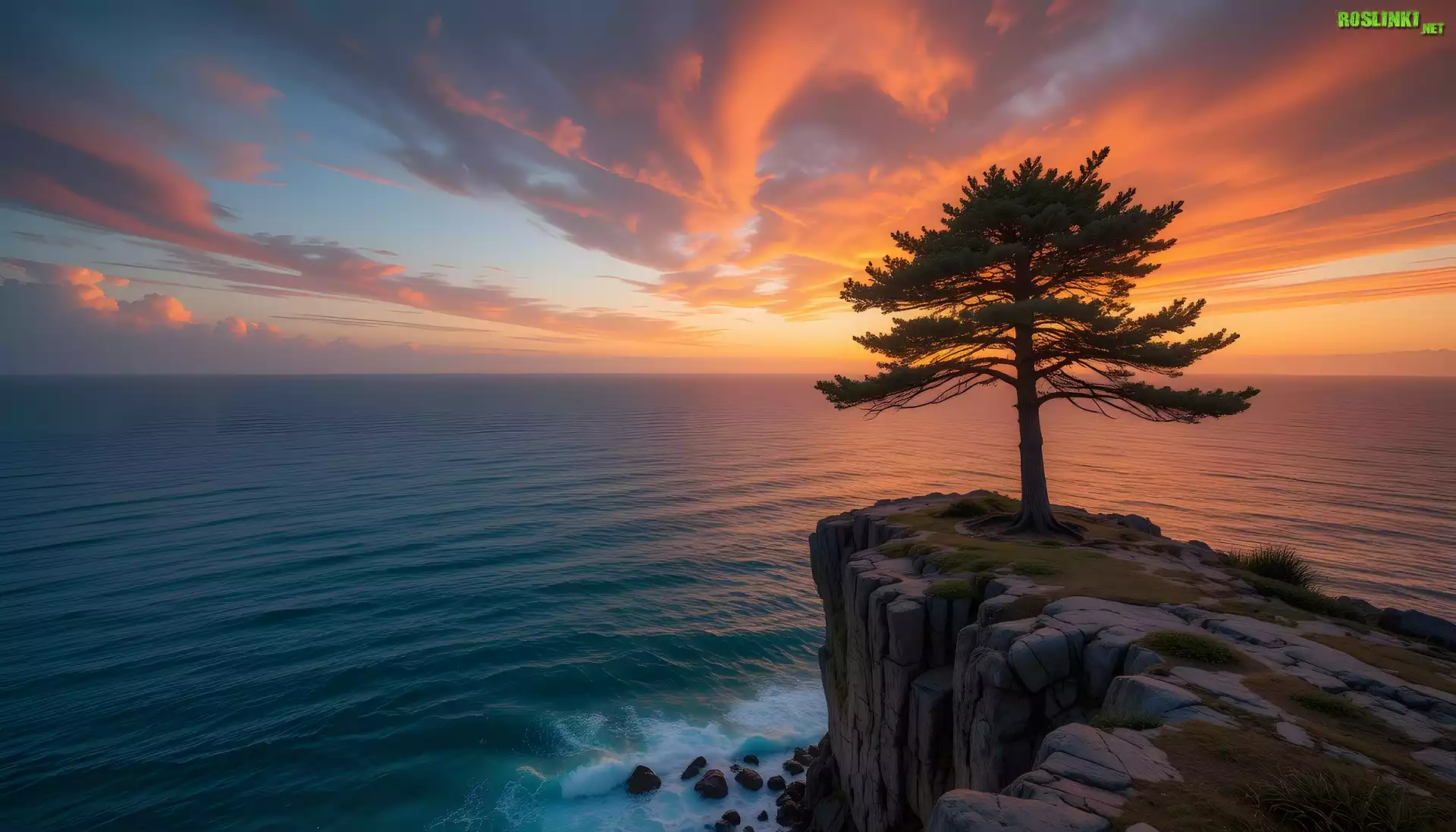 Rośliny: Morze, Skała, Sosna, Zachód słońca