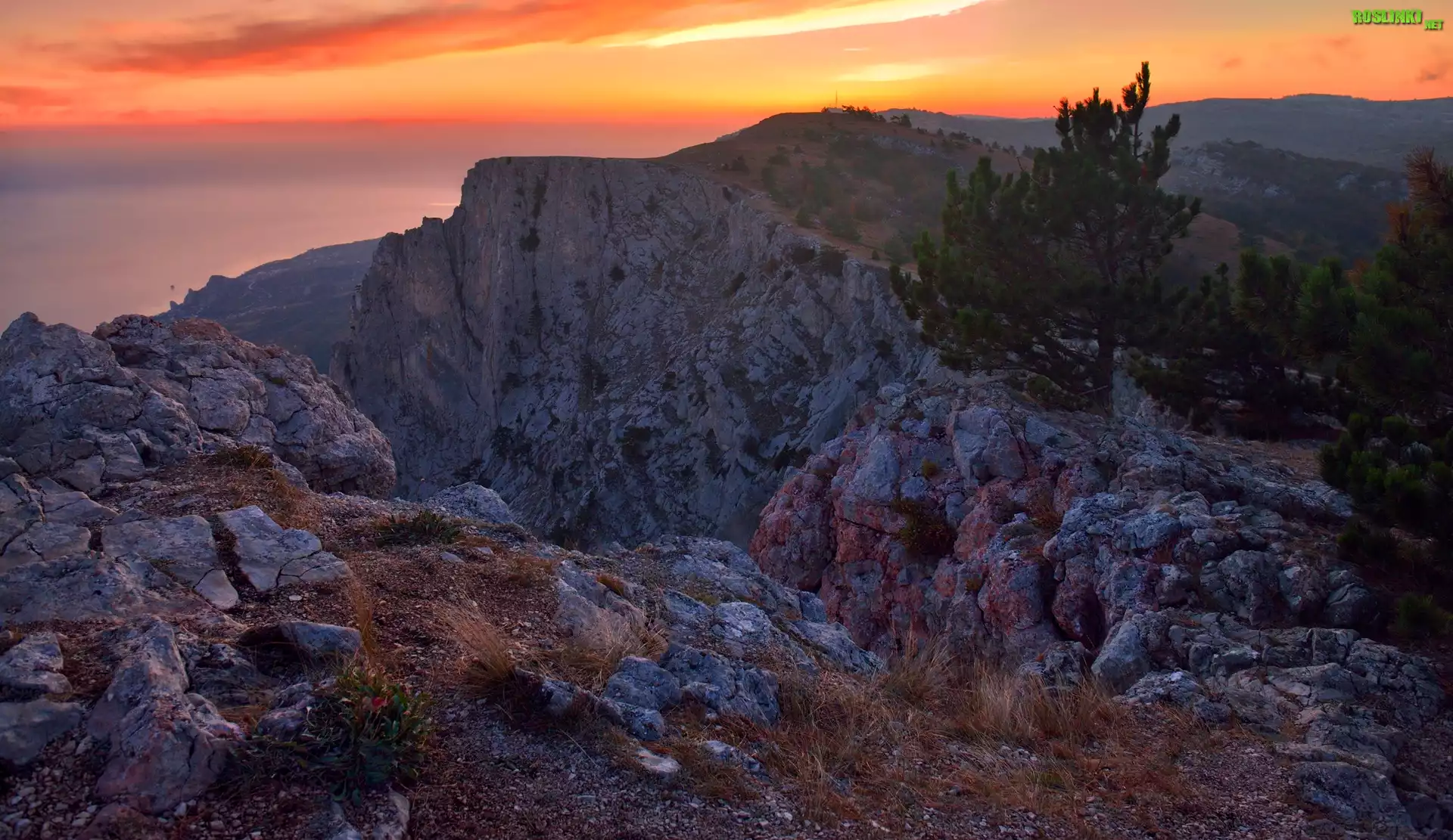 Rośliny: Skaliste, Góry, Skały, Zachód słońca, Drzewa
