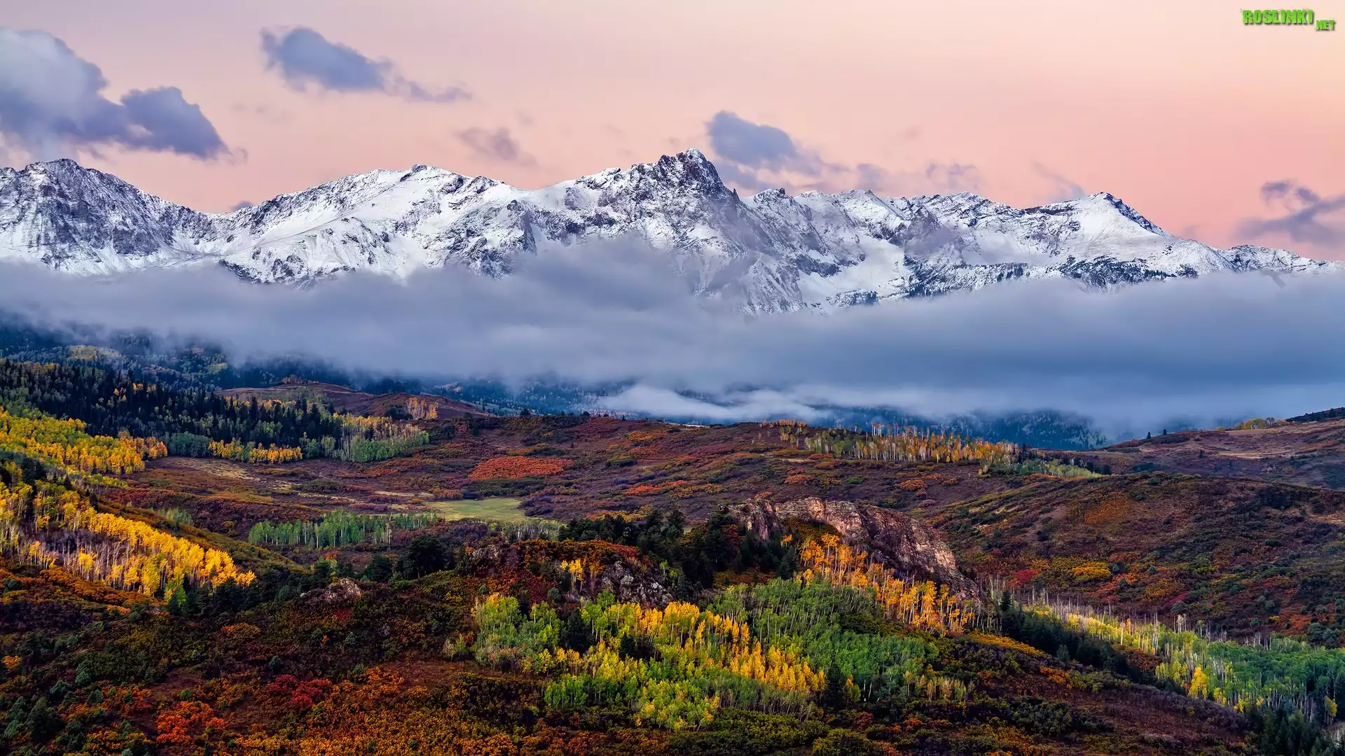 Jesień, Stany Zjednoczone, Kolorado, Szczyt, Mount Sneffels, Góry Skaliste, Lasy, Pożółkłe, Drzewa, Mgła, Chmury |