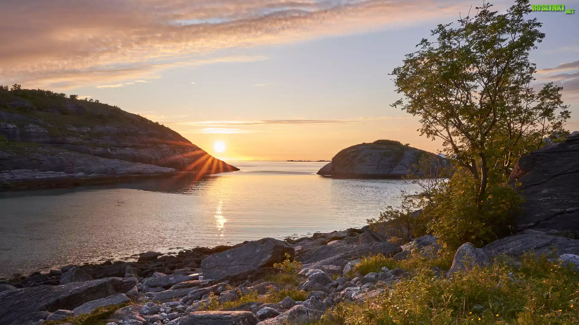 Rośliny: Jezioro, Skały, Kamienie, Drzewa, Krzewy, Wschód słońca, Chmury