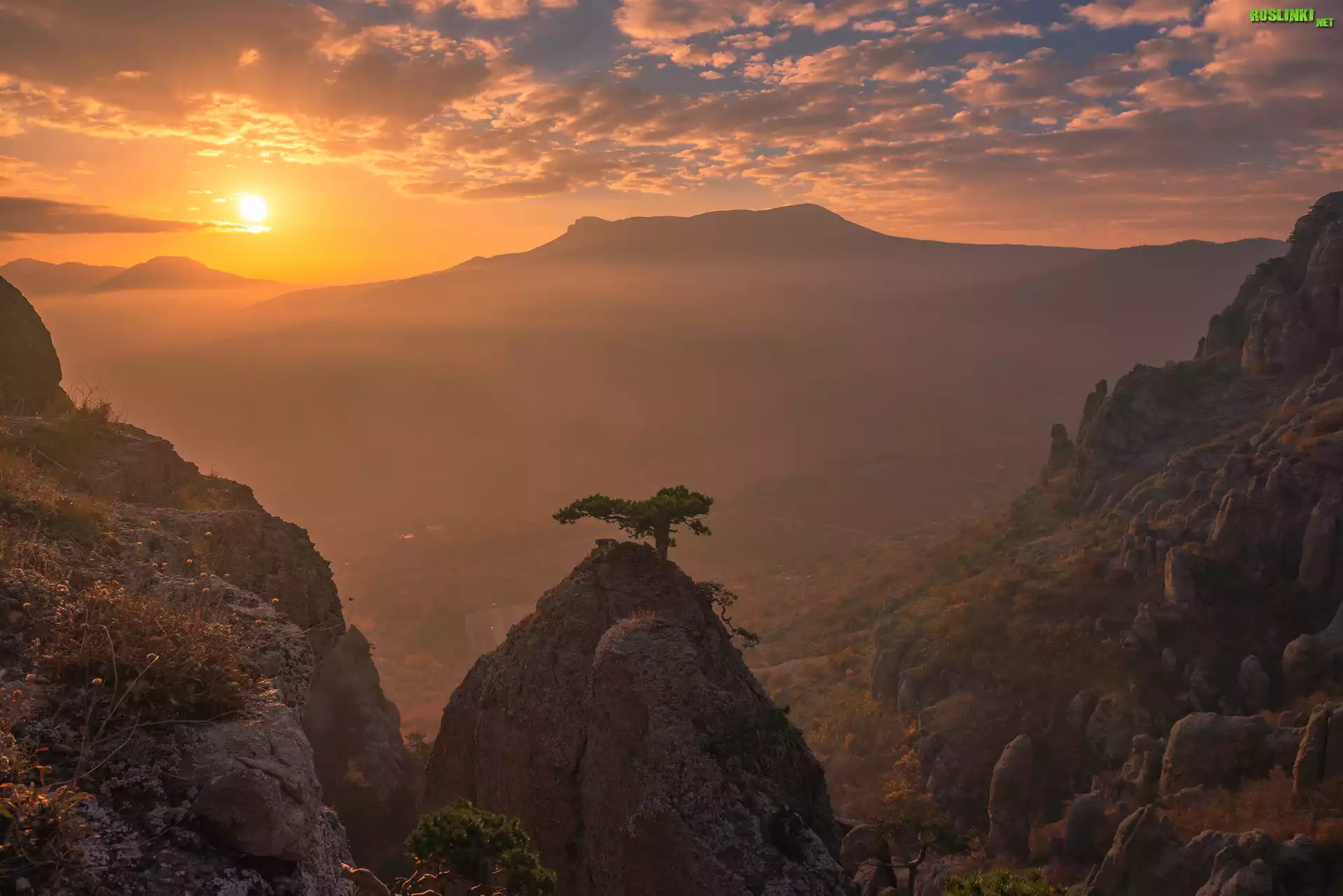 Rośliny: Góry, Skały, Sosna, Zachód słońca, Chmury, Mgła