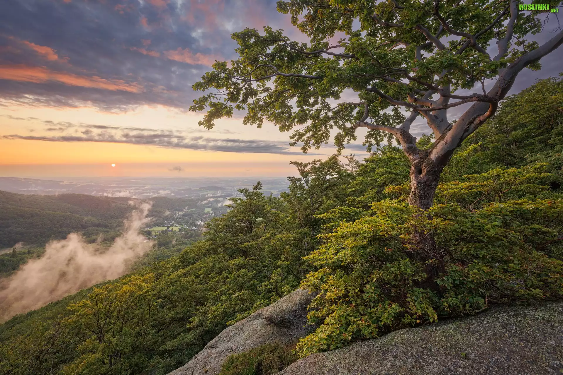 Rośliny: Zachód słońca, Góry, Skały, Drzewa, Krzewy, Chmury