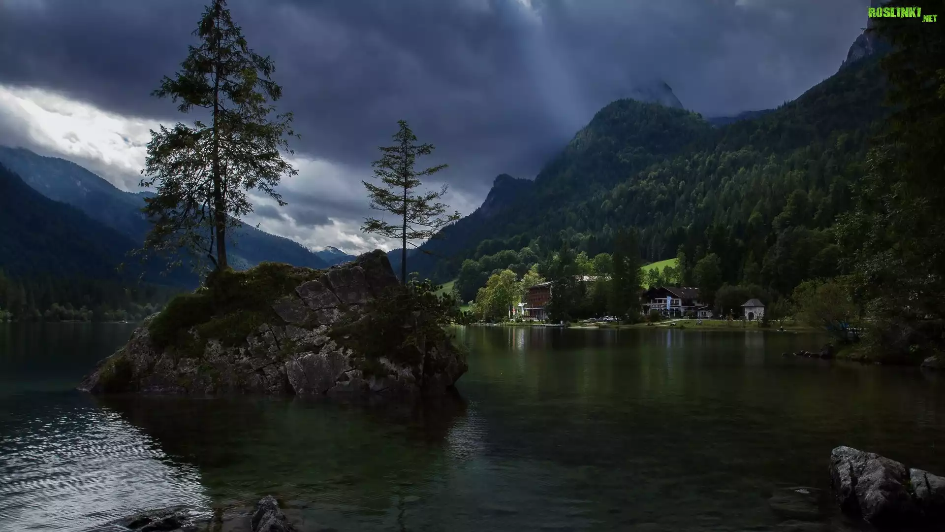 Rośliny: Góry, Jezioro, Hintersee, Skały, Domy, Drzewa, Niemcy