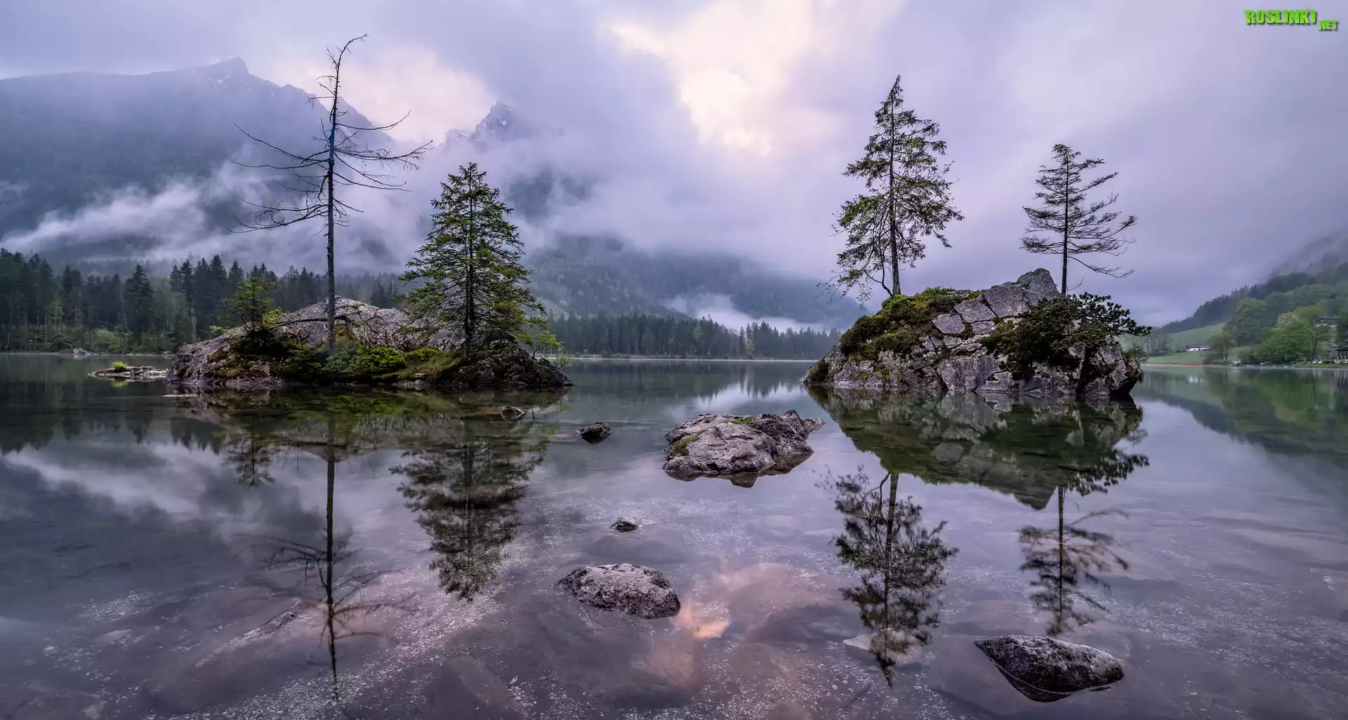 Jezioro Hintersee, Mgła, Wysepki, Drzewa, Skały, Kamienie, Góry, Alpy, Berchtesgaden, Bawaria, Niemcy |