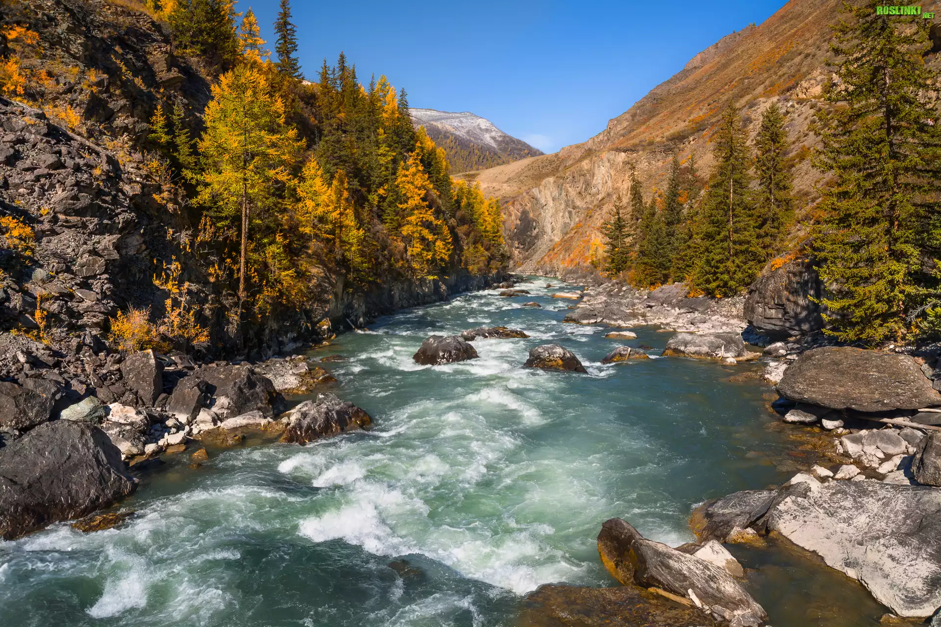 Rośliny: Rosja, Góry, Ałtaj, Rzeka Czuja, Kamienie, Skały, Las, Pożółkłe, Drzewa, Jesień