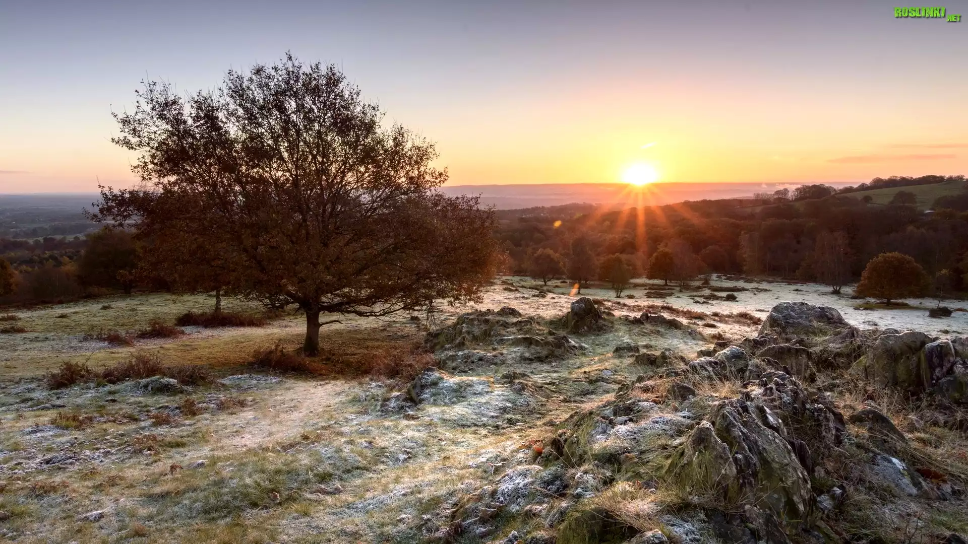 Rośliny: Anglia, Hrabstwo Leicestershire, Promienie słońca, Drzewa, Trawy, Kamienie, Skały