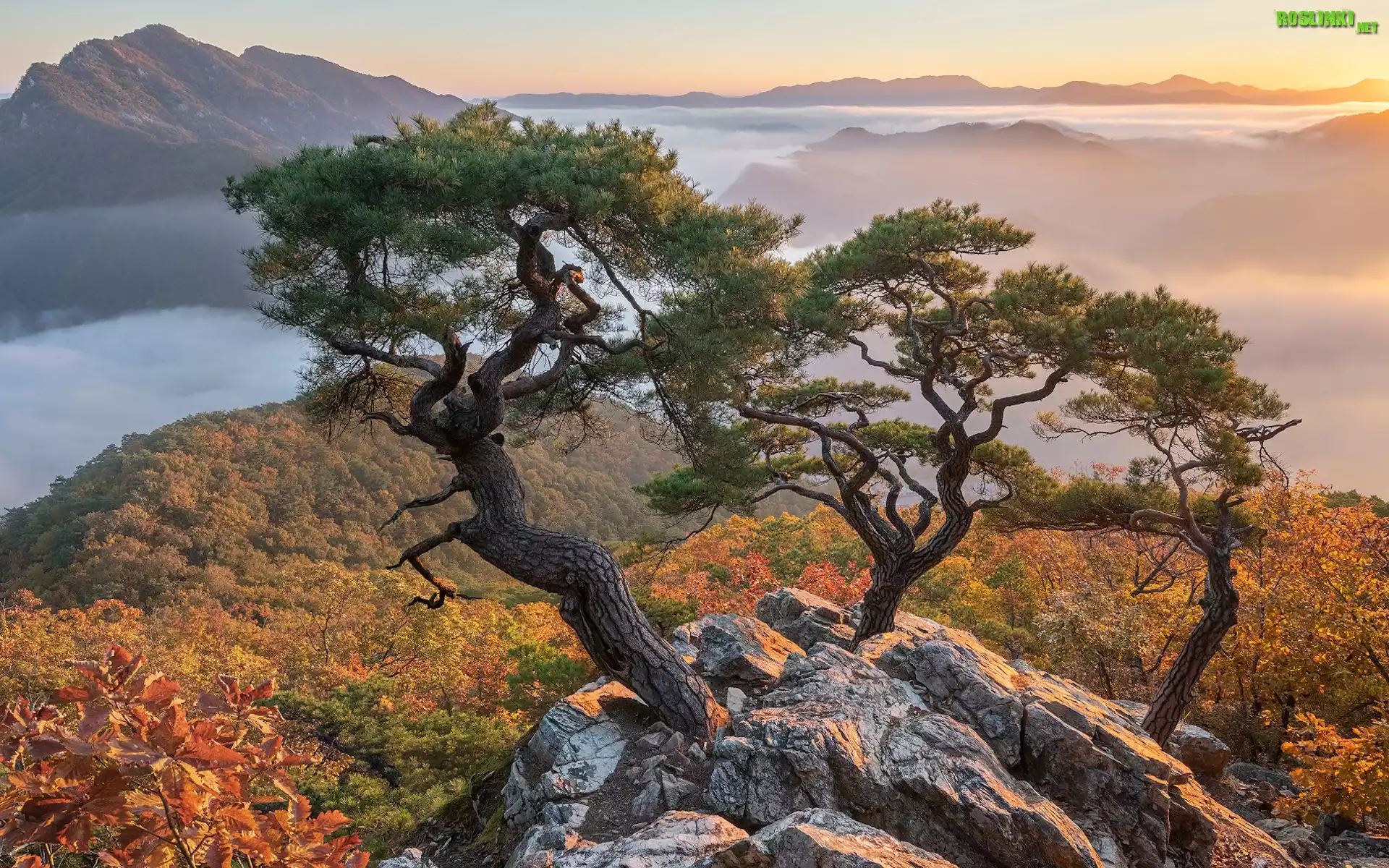 Rośliny: Góry, Skały, Mgła, Jesień, Sosna