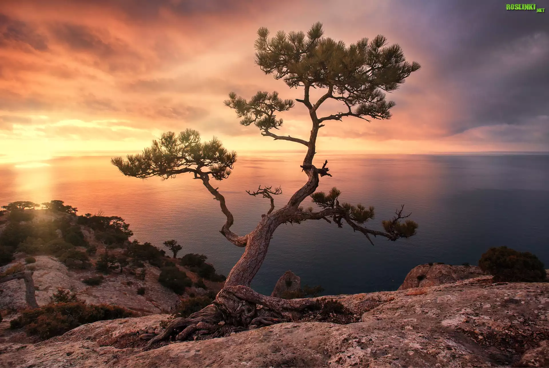 Rośliny: Morze, Skały, Drzewo, Sosna, Zachód słońca, Chmury