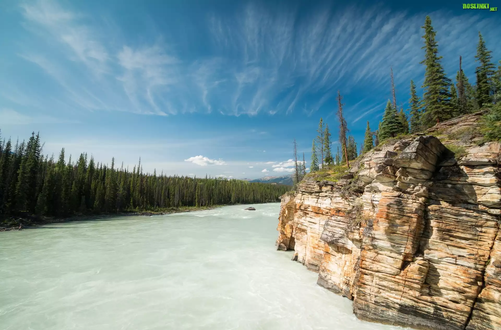 Rośliny: Kanada, Prowincja Alberta, Park Narodowy Jasper, Rzeka Athabaska, Drzewa, Skały