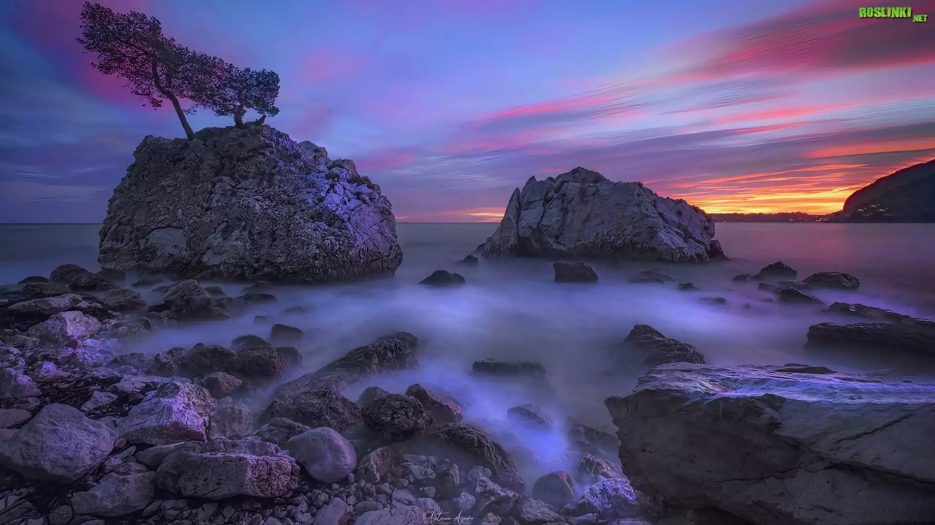 Rośliny: Zachód słońca, Morze, Skały, Drzewo, Niebo