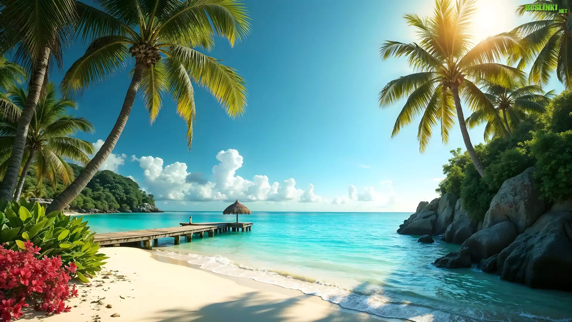 Rośliny: Morze, Plaża, Palmy, Skały, Roślinność, Pomost, AI