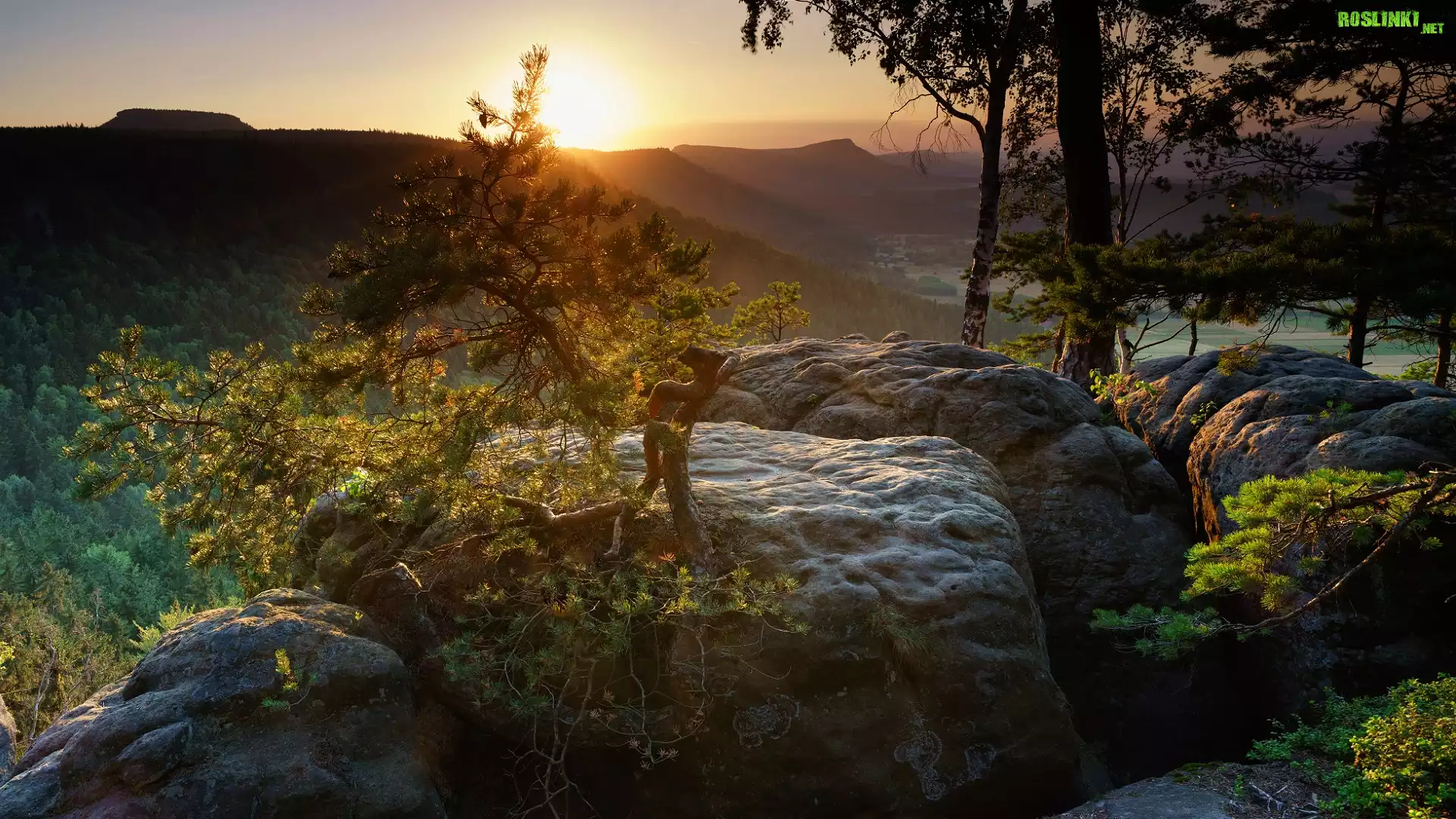 Polska, Sudety, Góry Stołowe, Radkowskie Skały, Zachód słońca, Kamienie, Głazy, Drzewa, Sosna |