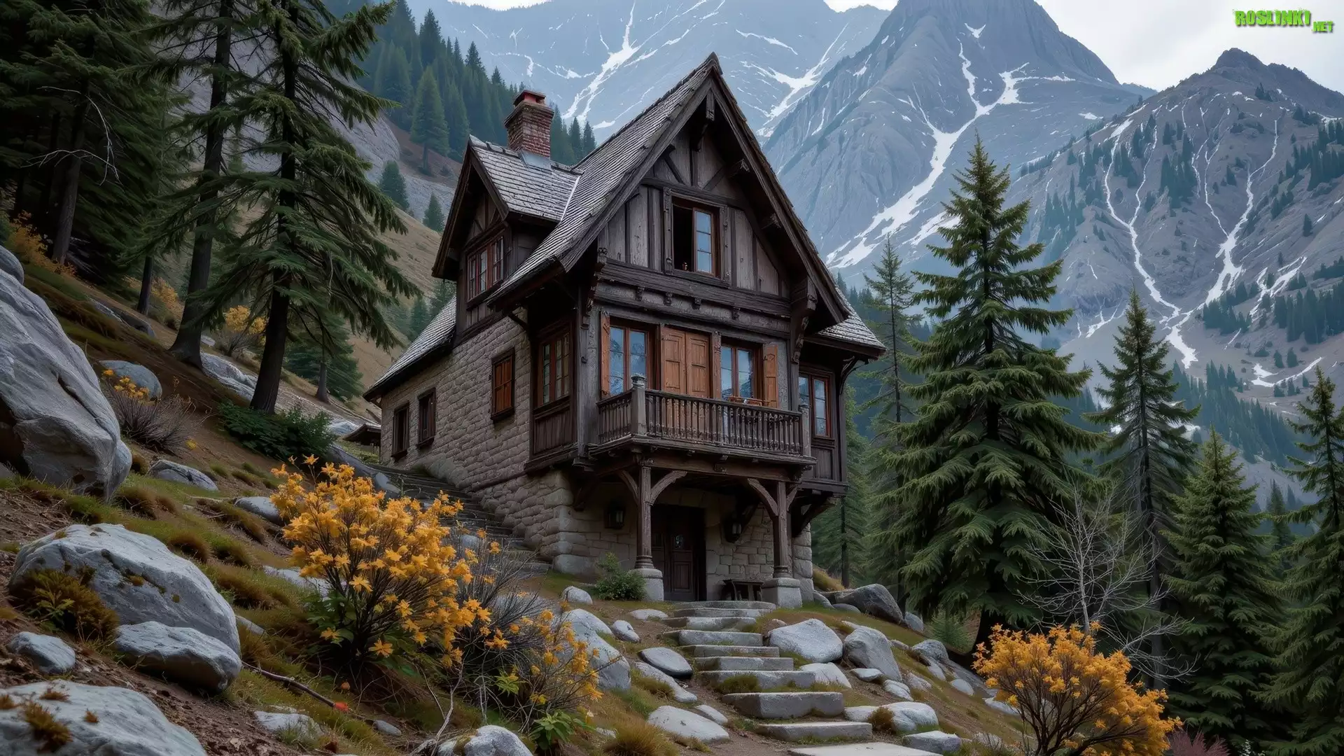 Góry, Dom, Schody, Skały, Drzewa, Grafika AI