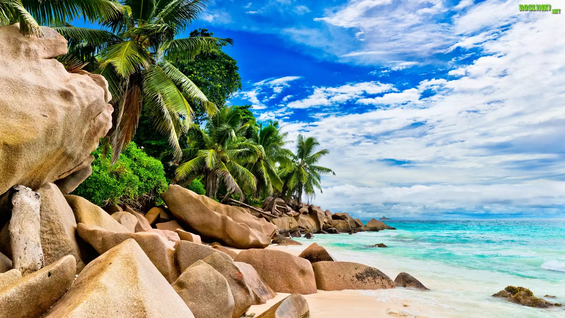 Rośliny: Seszele, Skały, Głazy, Palmy, Roślinność, Morze, Chmury