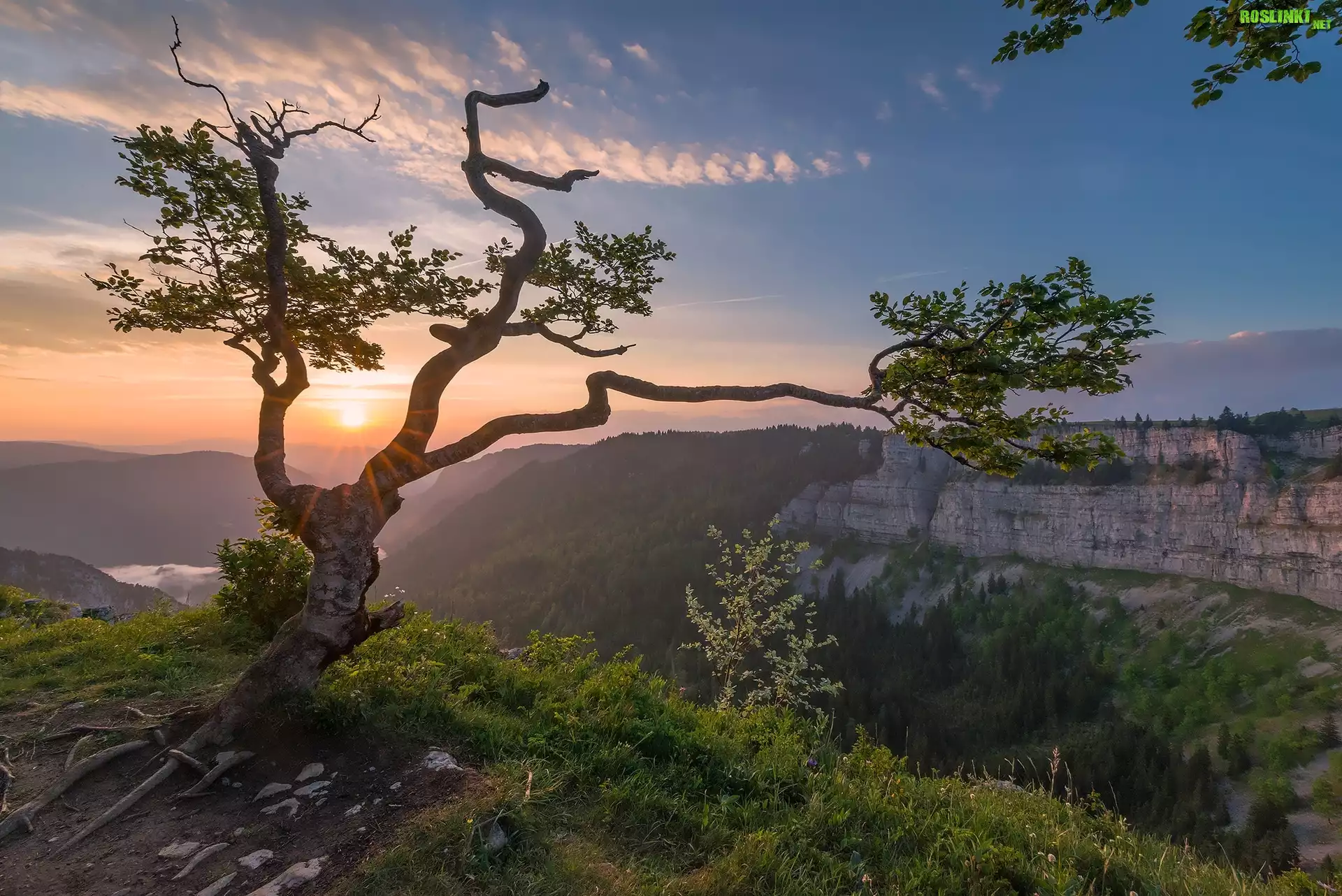 Skały, Atrakcja Creux du Van, Dolina Val de Travers, Kanton Neuchatel, Szwajcaria, Drzewo, Wschód słońca, Chmury |