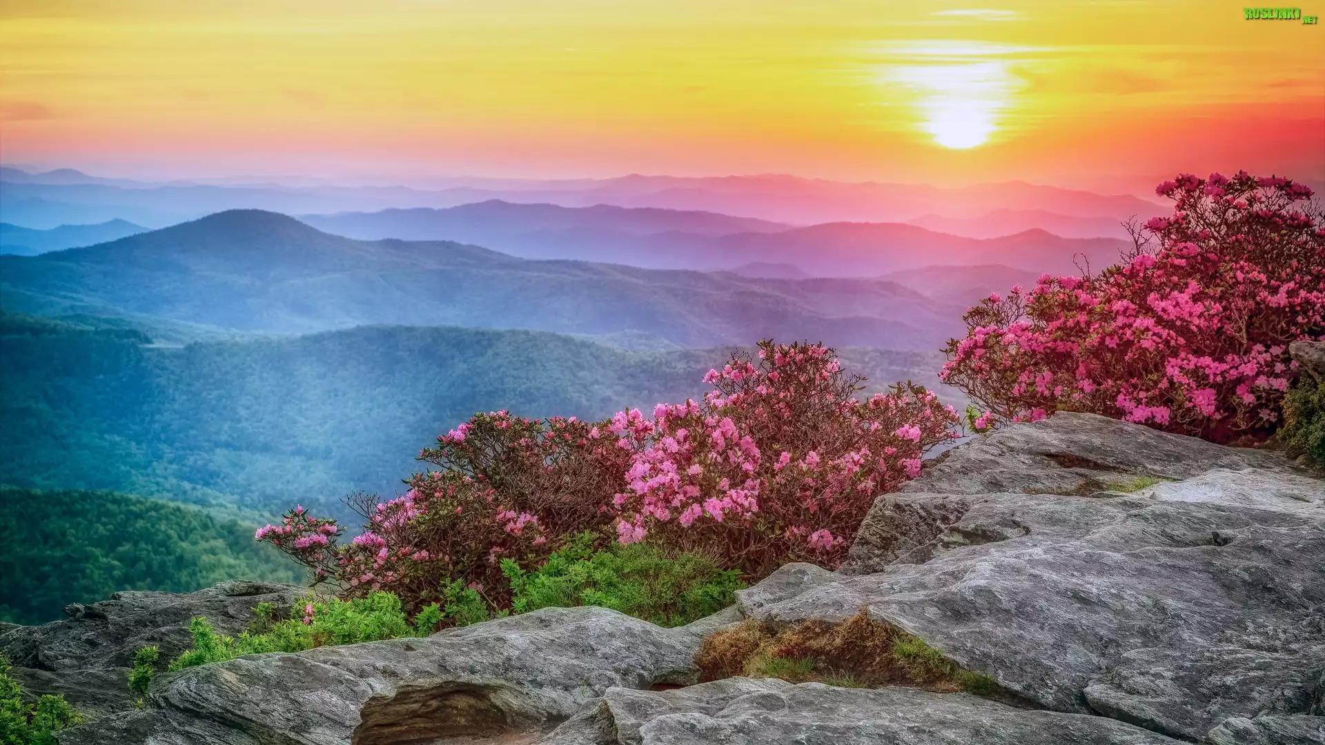 Rośliny: Góry, Wschód słońca, Mgła, Różowe, Kwiaty, Krzewy, Różaneczniki Skały