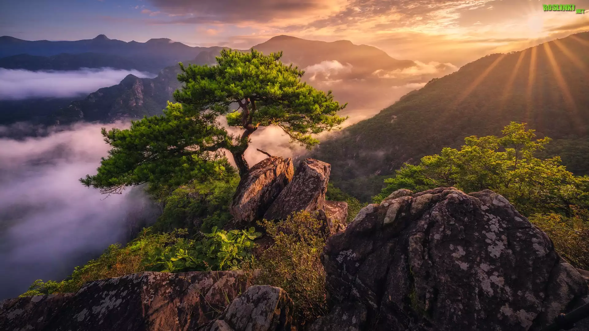 Rośliny: Góry, Wschód słońca, Skały, Drzewa, Sosny, Mgła