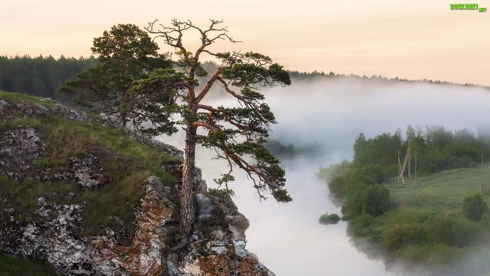 Skały, Mgła, Drzewo, Sosna, Roślinność