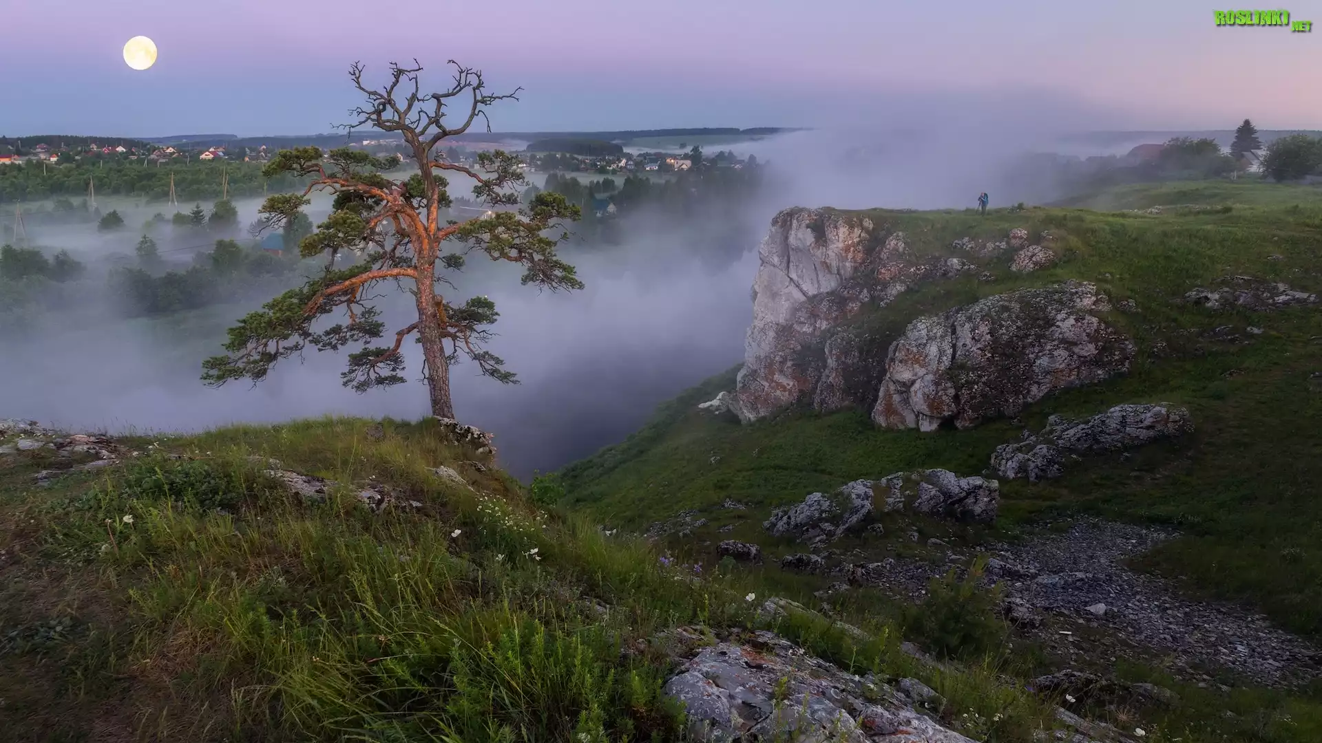Rośliny: Skały, Mgła, Księżyc, Drzewo, Sosna, Roślinność
