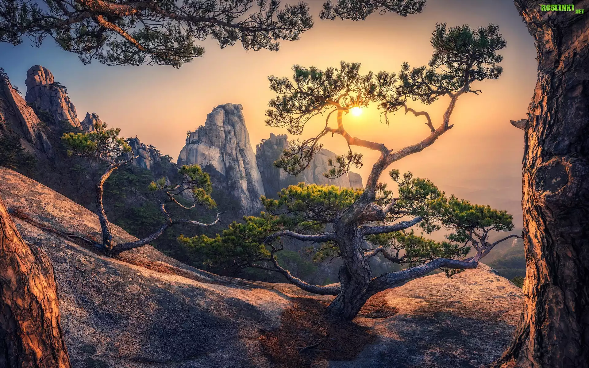 Rośliny: Góry, Wschód słońca, Skały, Drzewa, Sosny