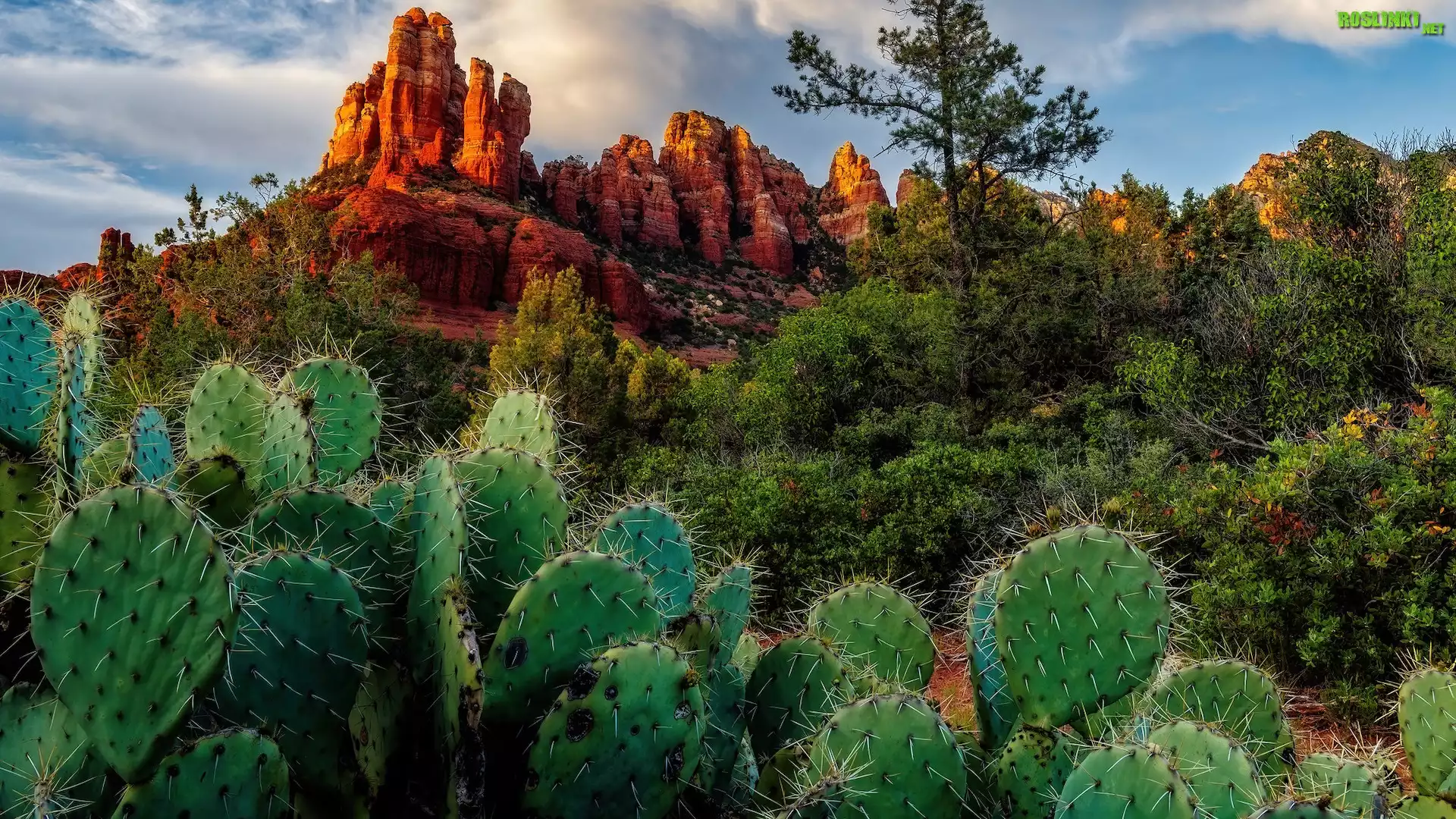 Stany Zjednoczone, Stan Arizona, Hrabstwo Coconino, Sedona, Crimsons Cliff, Skały, Drzewa, Kaktusy