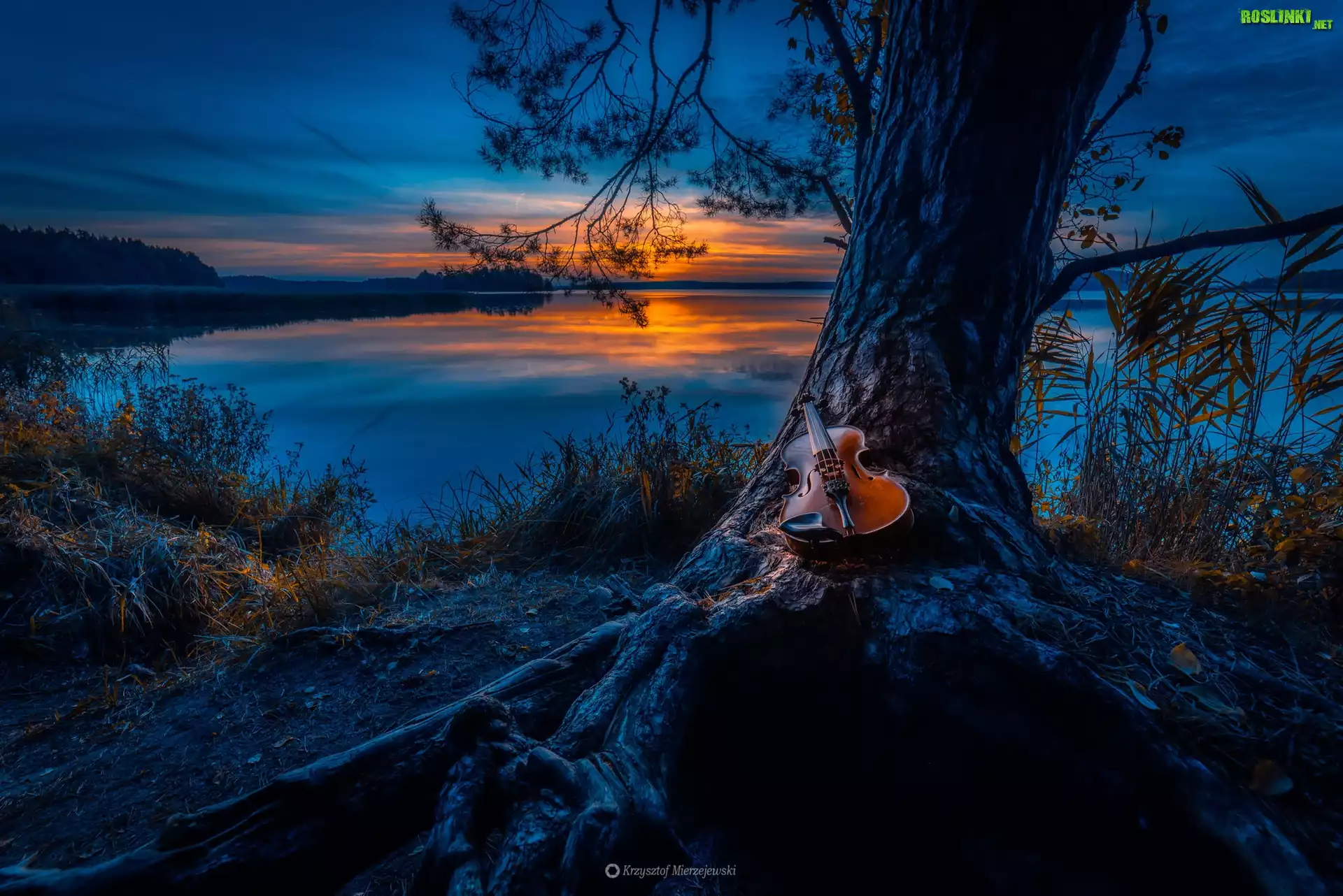 Rośliny: Drzewo, Skrzypce, Jezioro, Zachód słońca
