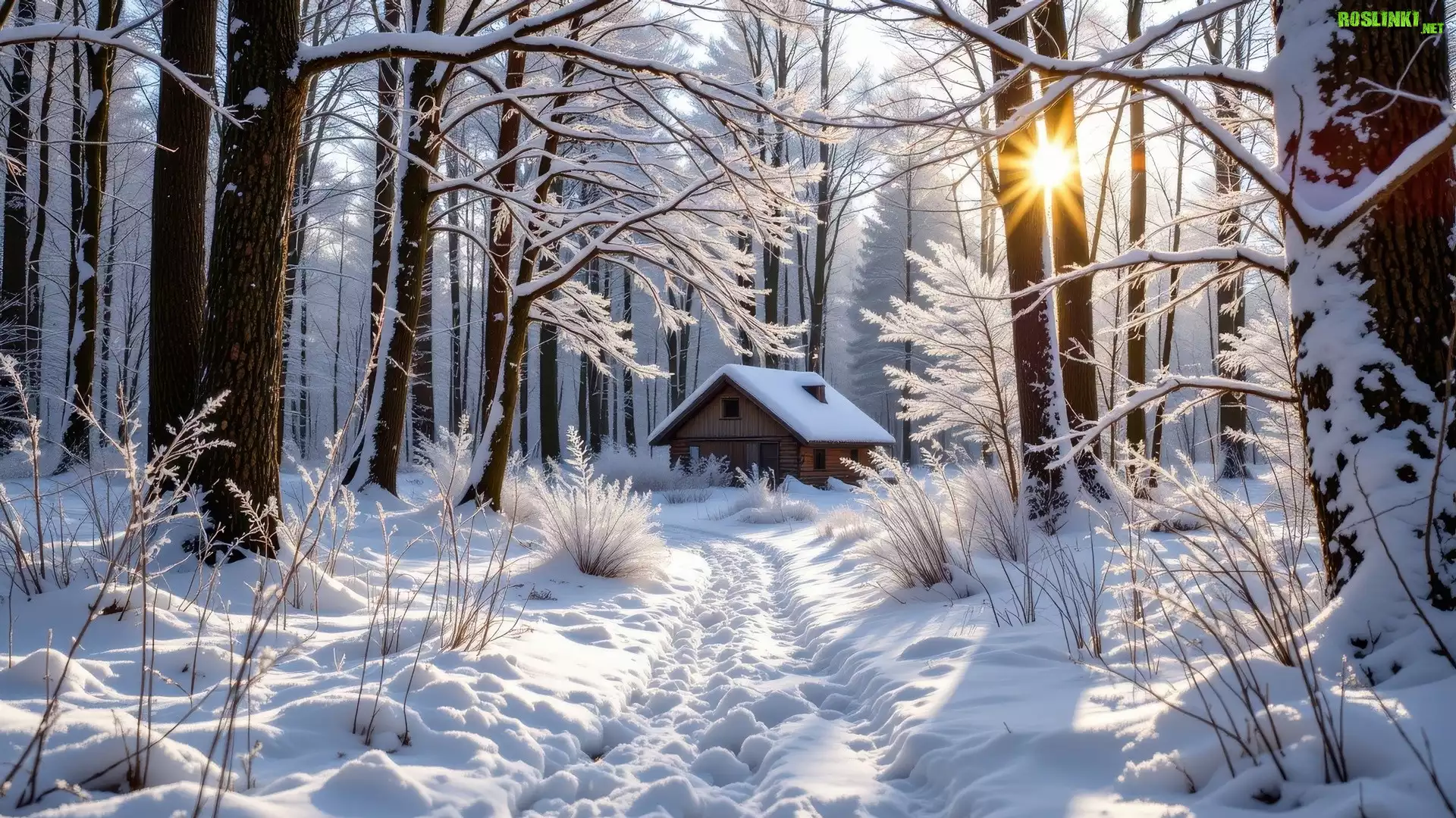 Rośliny: Zima, Las, Dom, Ośnieżone, Drzewa, Krzewy, Droga, Ślady