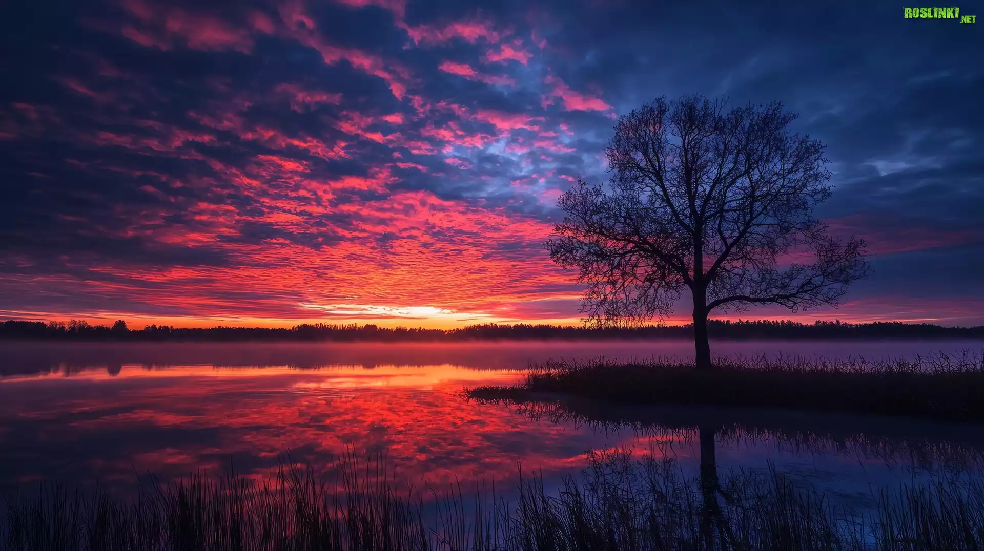 Rośliny: Jezioro, Drzewo, Zachód słońca, Grafika AI