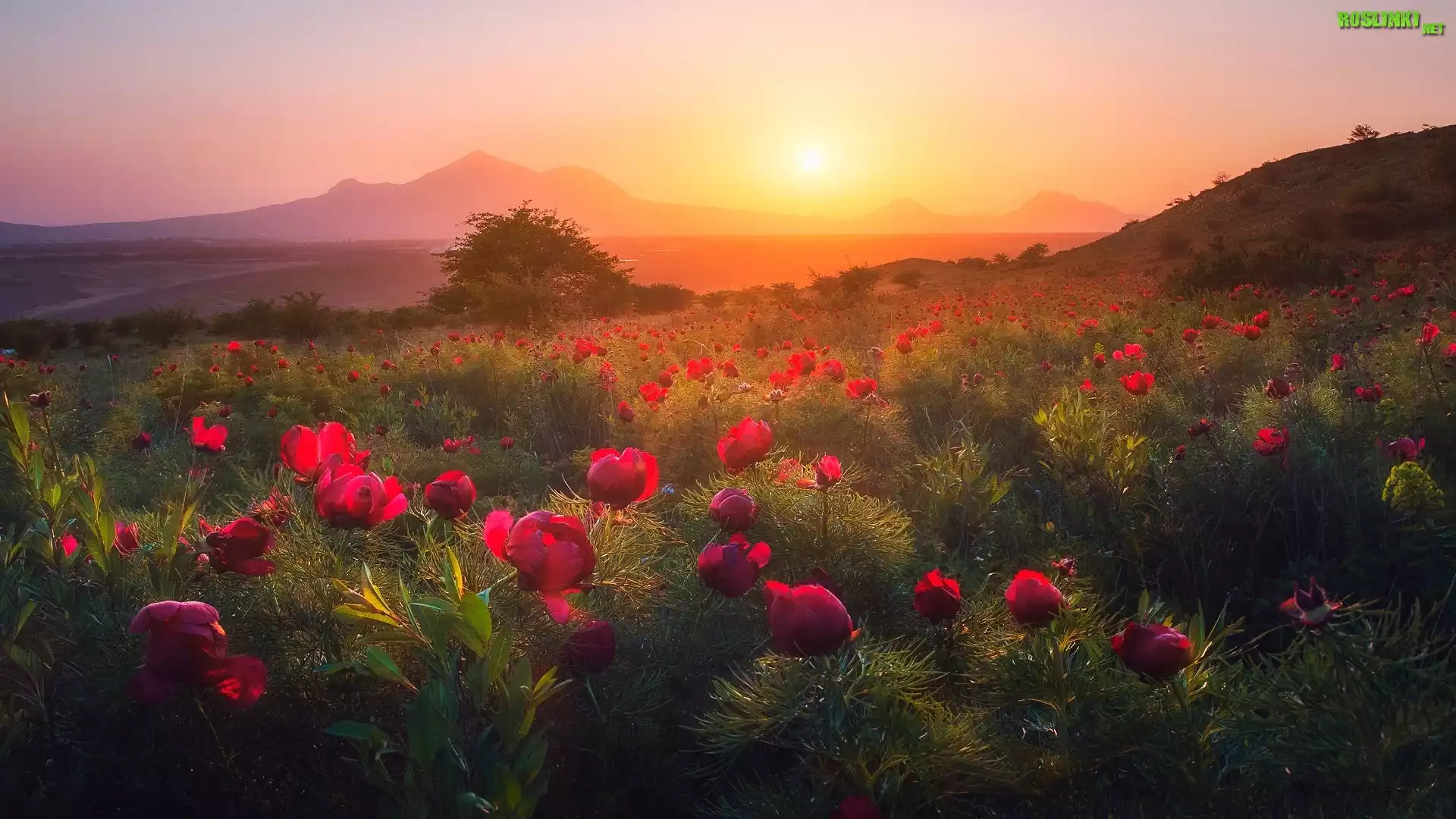 Rośliny: Zachód słońca, Góry, Pole, Drzewo, Kwiaty, Piwonie, Łąka
