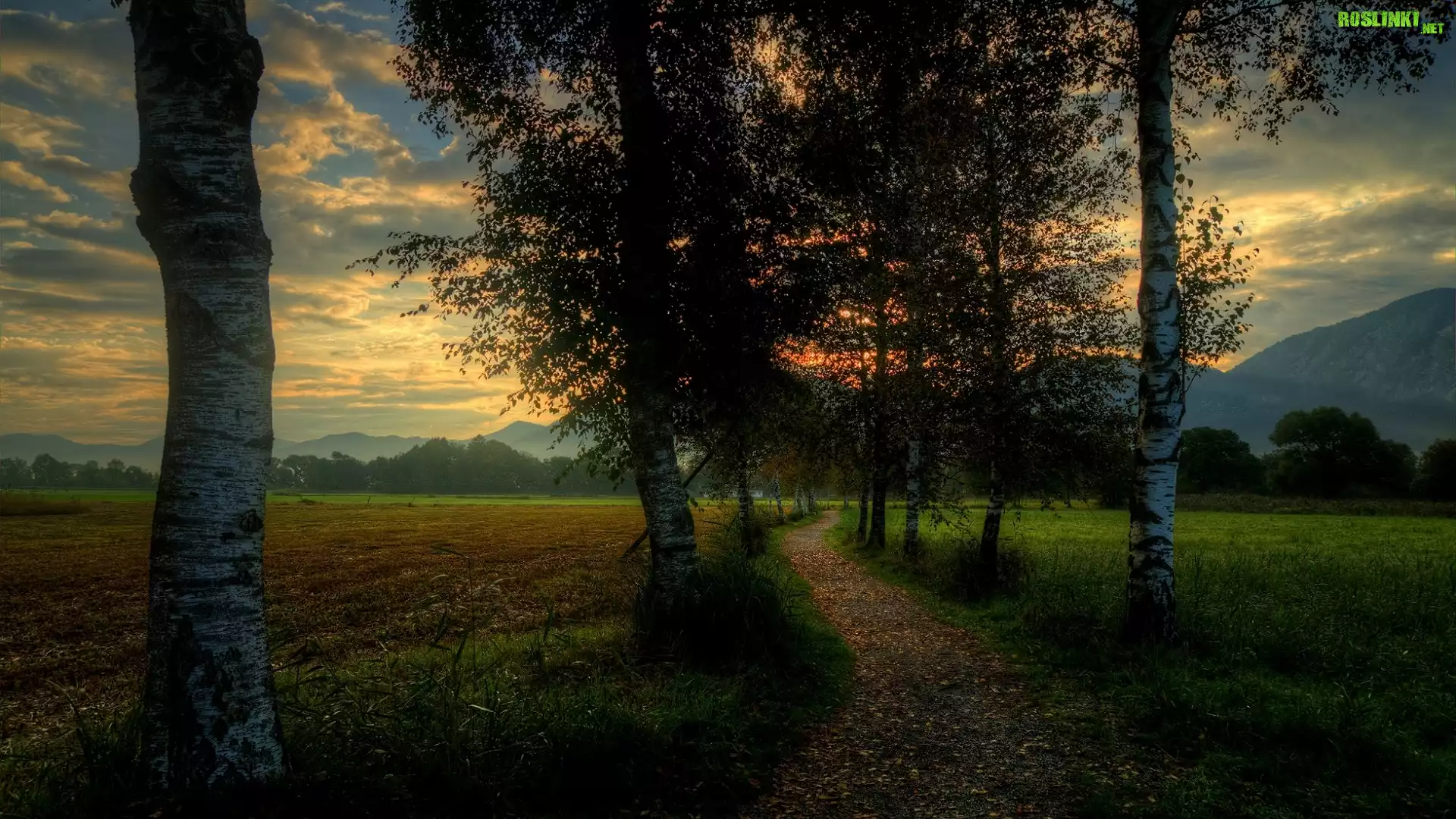Rośliny: Wschód słońca, Mgła, Góry, Pola, Droga, Drzewa, Brzozy