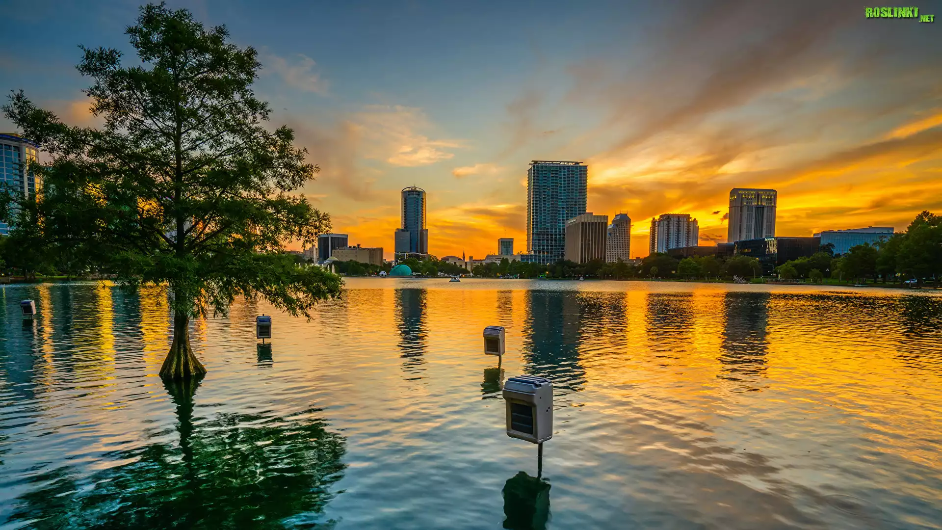 Rośliny: Zachód słońca, Domy, Jezioro, Drzewo