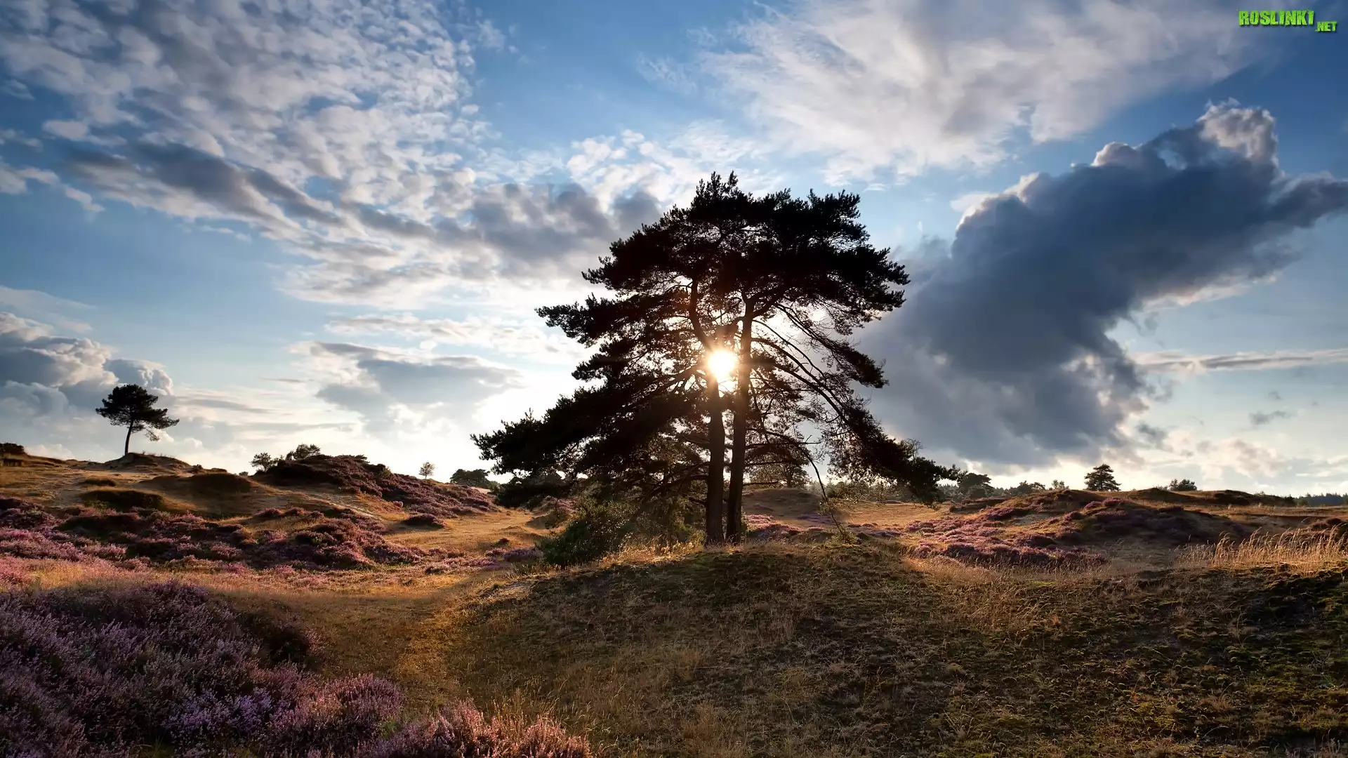 Rośliny: Holandia, Prowincja Drenthe, Chmury, Pagórki, Wrzosowisko, Drzewo, Promienie słońca