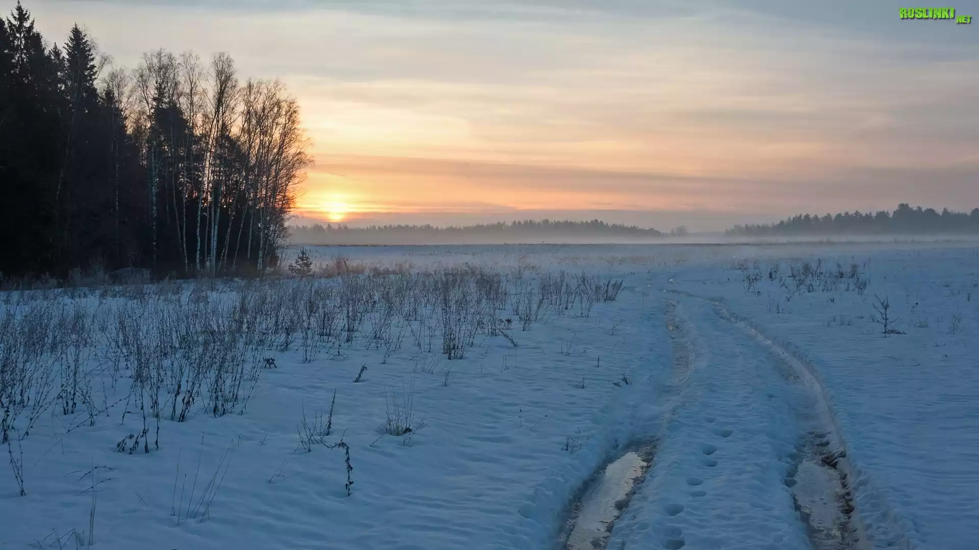Rośliny: Zima, Las, Droga, Śnieg, Ślady, Drzewa, Krzewy, Wschód słońca