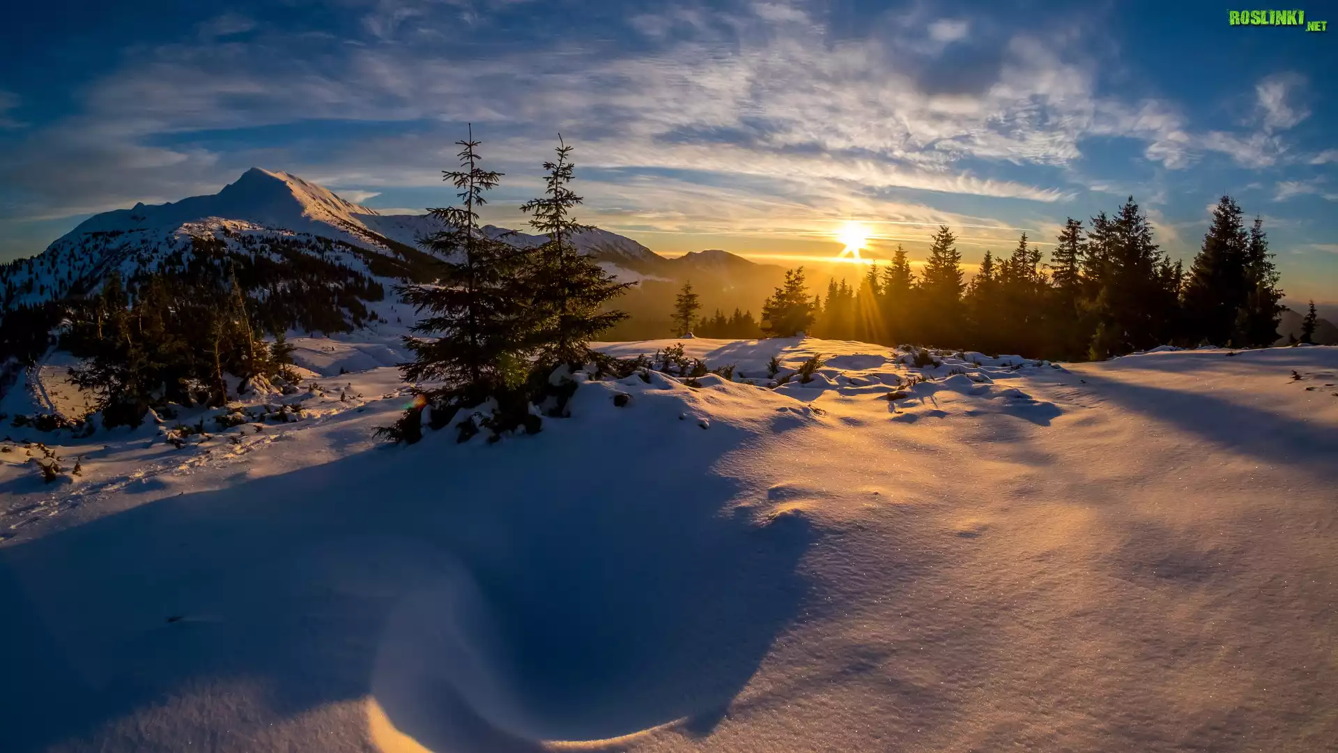 Rośliny: Zima, Góry, Drzewa, Zaspy, Śnieg, Niebo, Zachód słońca
