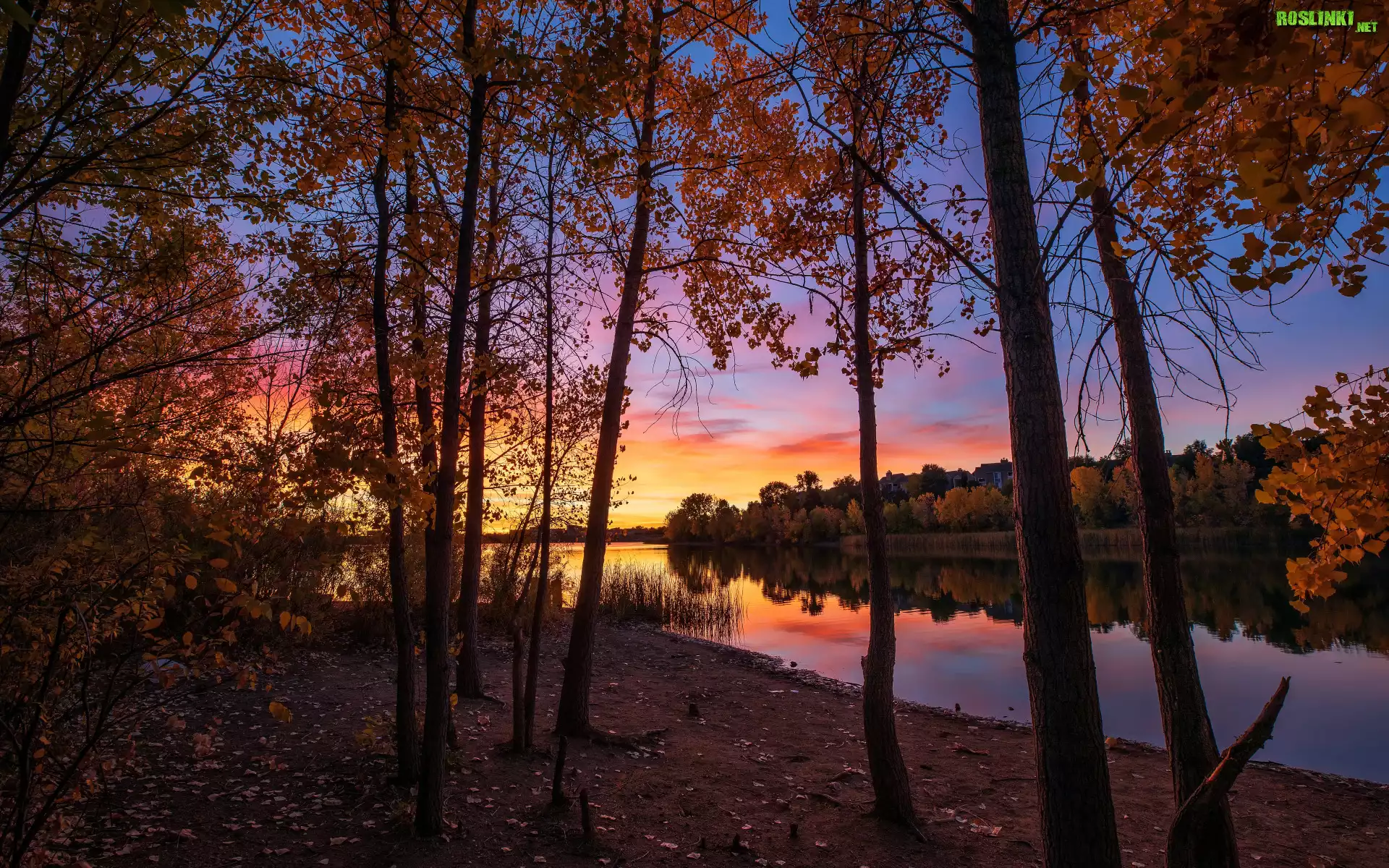 Stany Zjednoczone, Kolorado, Quail Lake, Jesień, Las, Drzewa, Jezioro, Liście, Niebo, Zachód słońca |