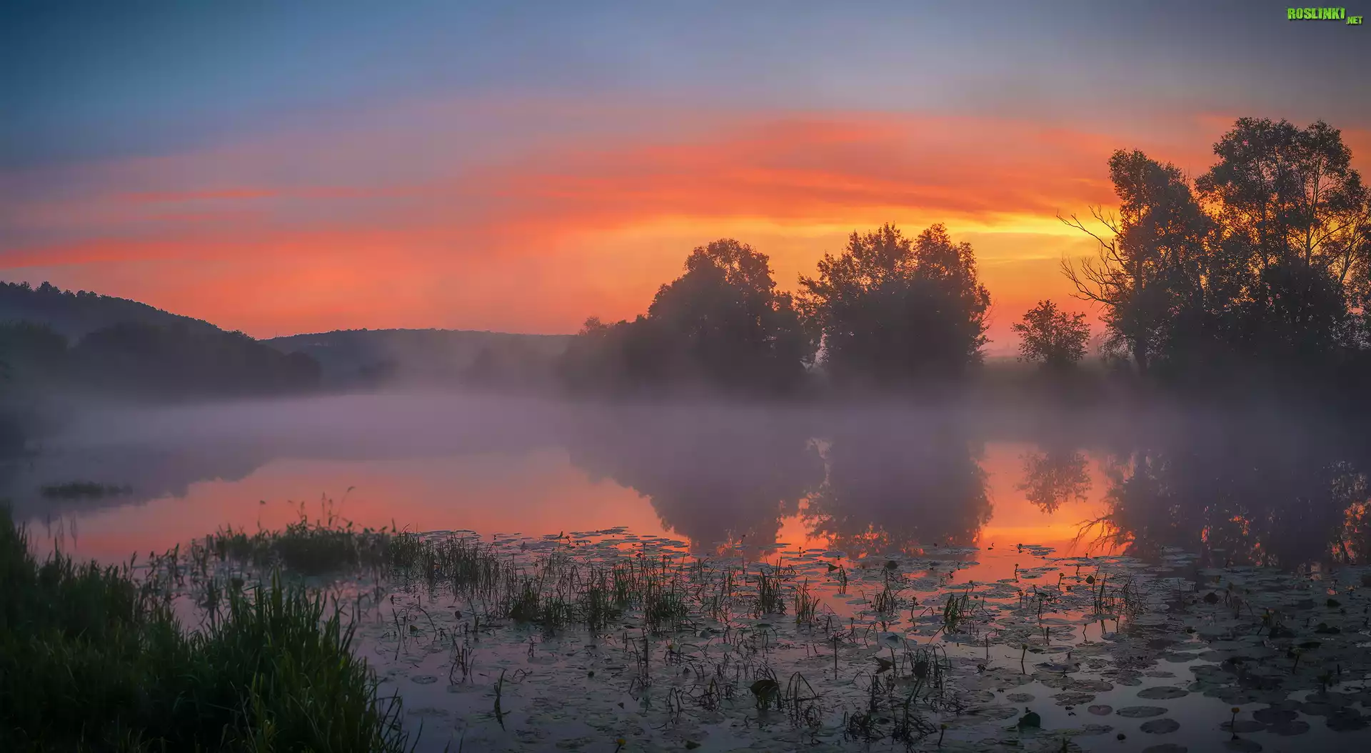 Rośliny: Staw, Mgła, Drzewa, Trawa, Liście, Lilii wodnych, Wschód słońca