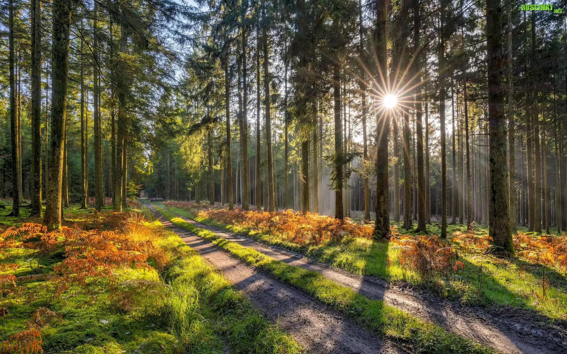 Rośliny: Las, Droga, Promienie słońca, Wysokie, Drzewa